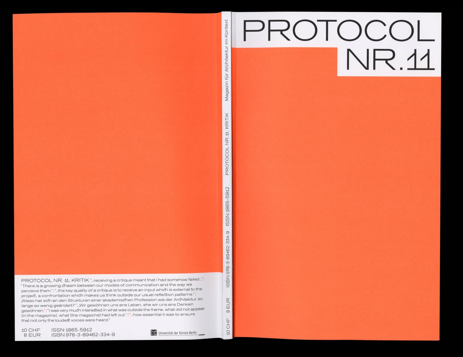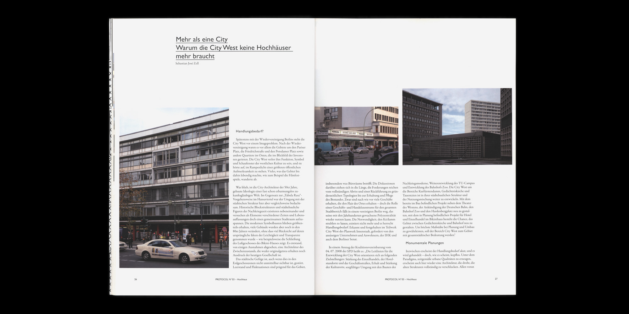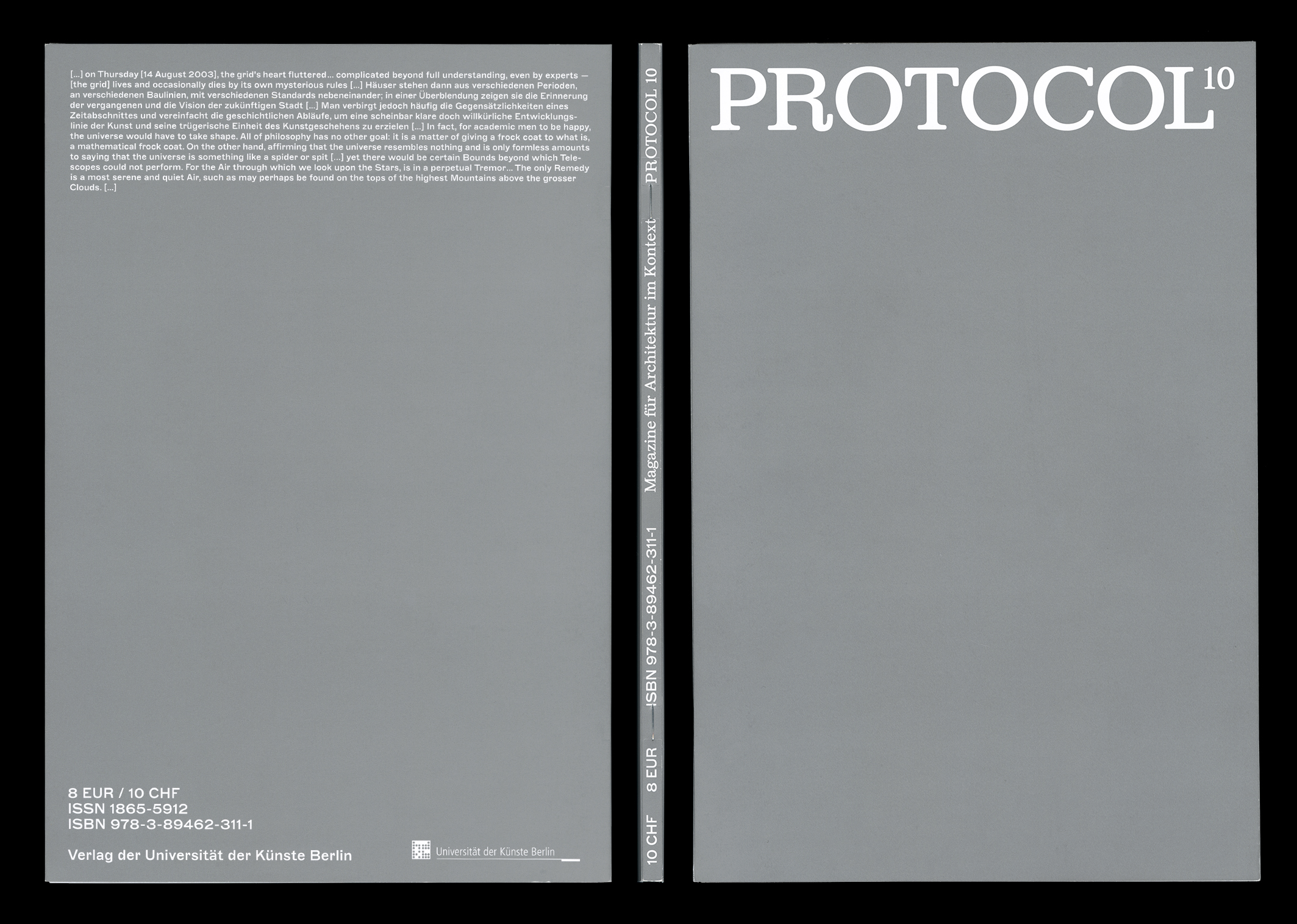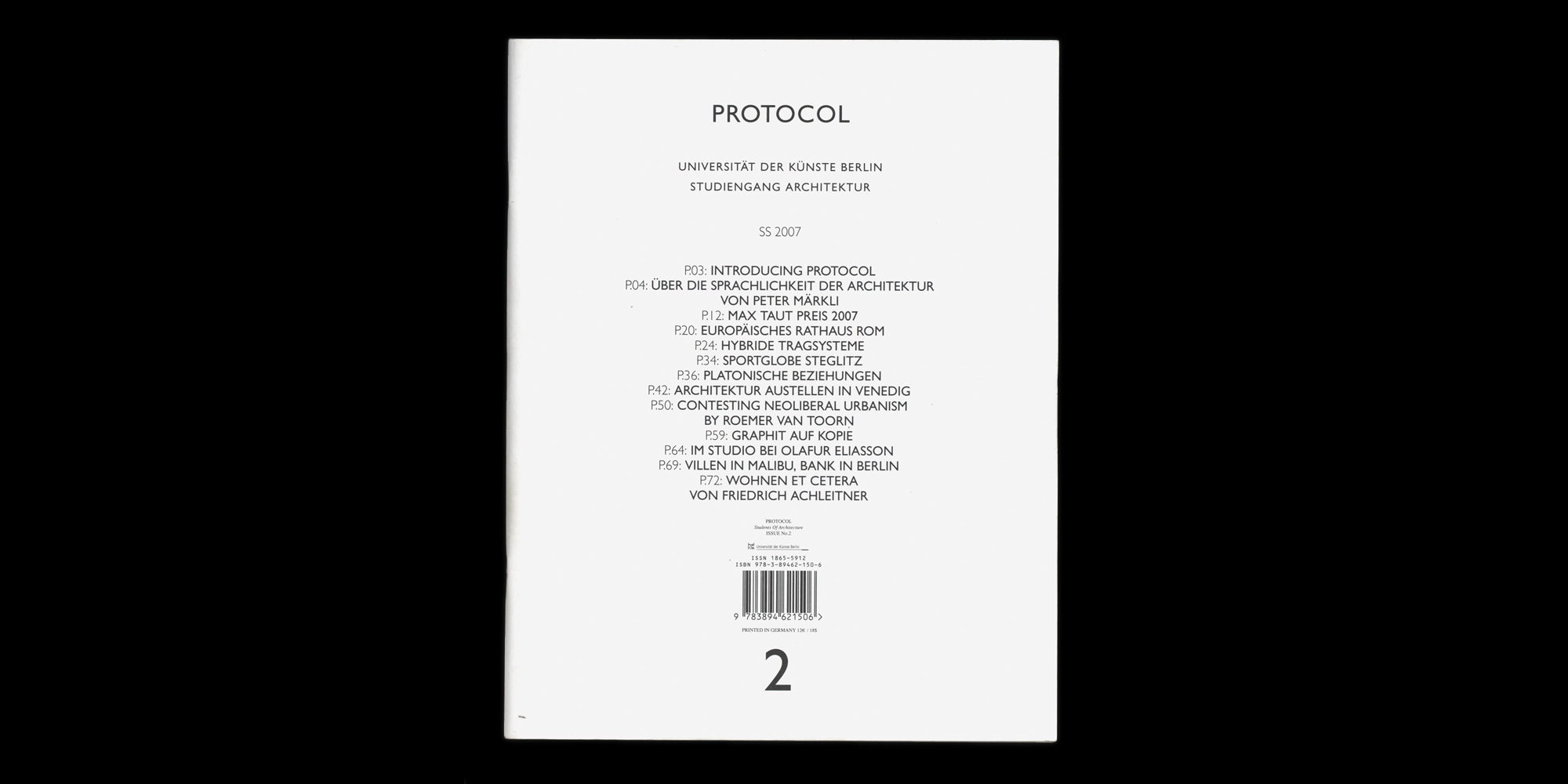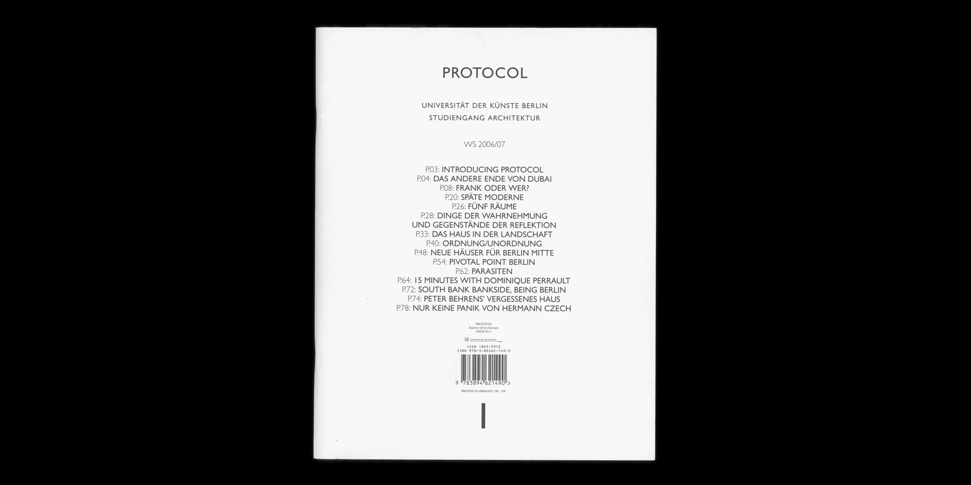Introducing Protocol: ‘Making’ a name for a magazine begins with choosing its direction. Current, Print Out, Probe, Processed, Prospect... Protocol was selected because of the sound and texture of the word. And its multiple connotations seemed appropriate for the new architectural periodical of Berlin University of the Arts. The word is usually associated with the term ‘convention’ or the objective act of documenting and, insofar as this publication covers issues in and around an architecture department, it conforms to that definition. At the same time documenting implies perceiving, questioning, reading – particularly when the subject at hand is connected to inventive and intellectual pursuits. This ambivalence is reflected in the magazine’s ‘disposition’. Protocol is in fact a loosely erdered compendium of ideas circulating among the students, of input and output processed, but also of catalysing contributions from teachers, guest critics and lecturers. The running order suggested on the cover, which of course nobody is obliged to follow, gives a catalogue or record of significant occurrences. There are travellers’ tales vis-à-vis urban criticism, theoretical essays alongside absorbing work reports and diverting interviews, projects with a vague relationship to reality versus genuinely feasible construction proposals, and high-end images augment photographic series in which awkward models take on a bohemian beauty. The ‘otherness’ of approaches affords a blend of insights and once in a while a shift in perspective. More than just a double-take, Protocol provides a framewerk for up-and-coming architects, designers and writers to take a place between established practitioners and critics. As an ink-and-paper test bed, it has to remain crisp only until the next issue is released.