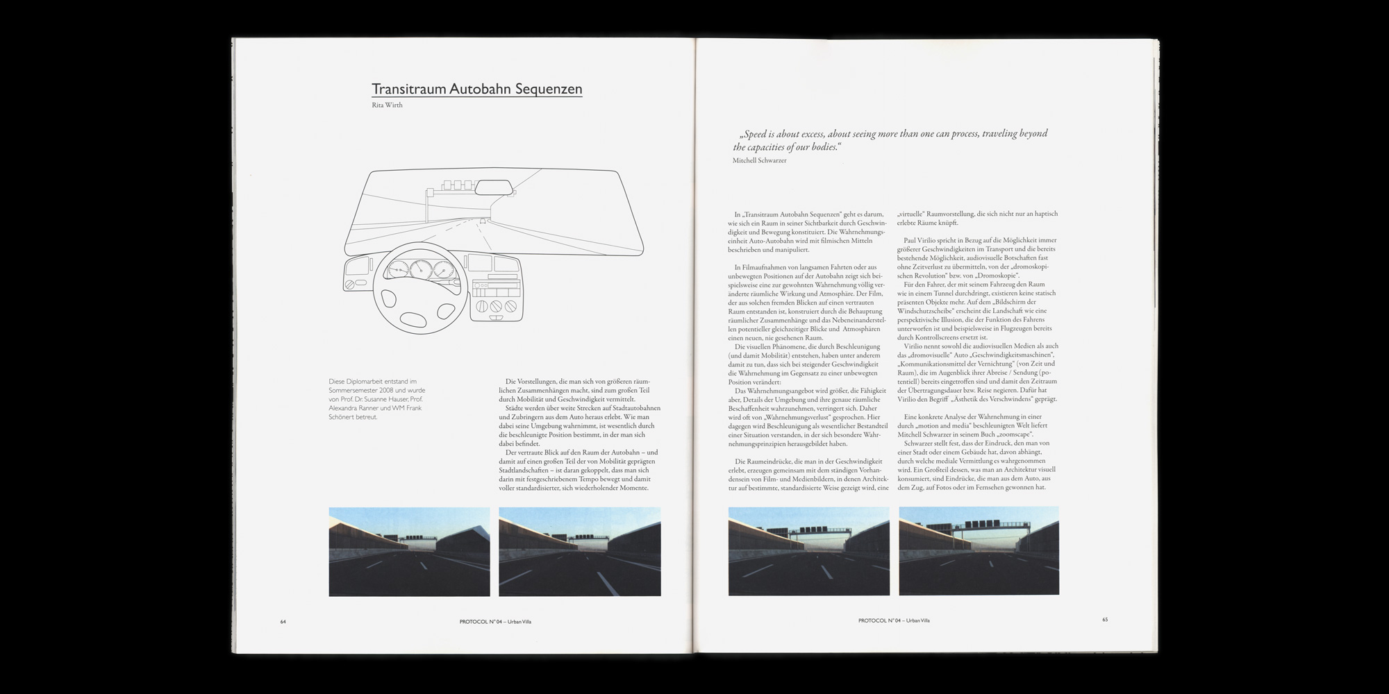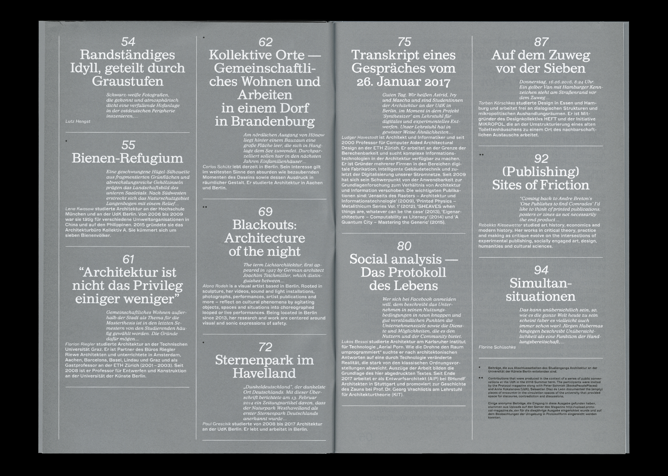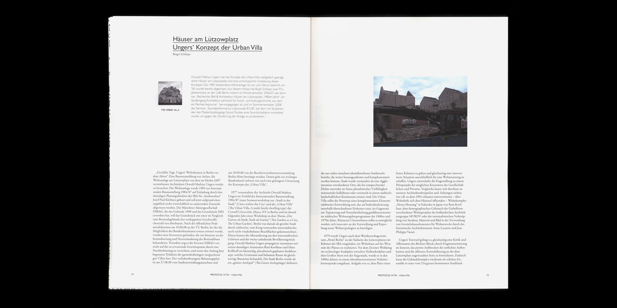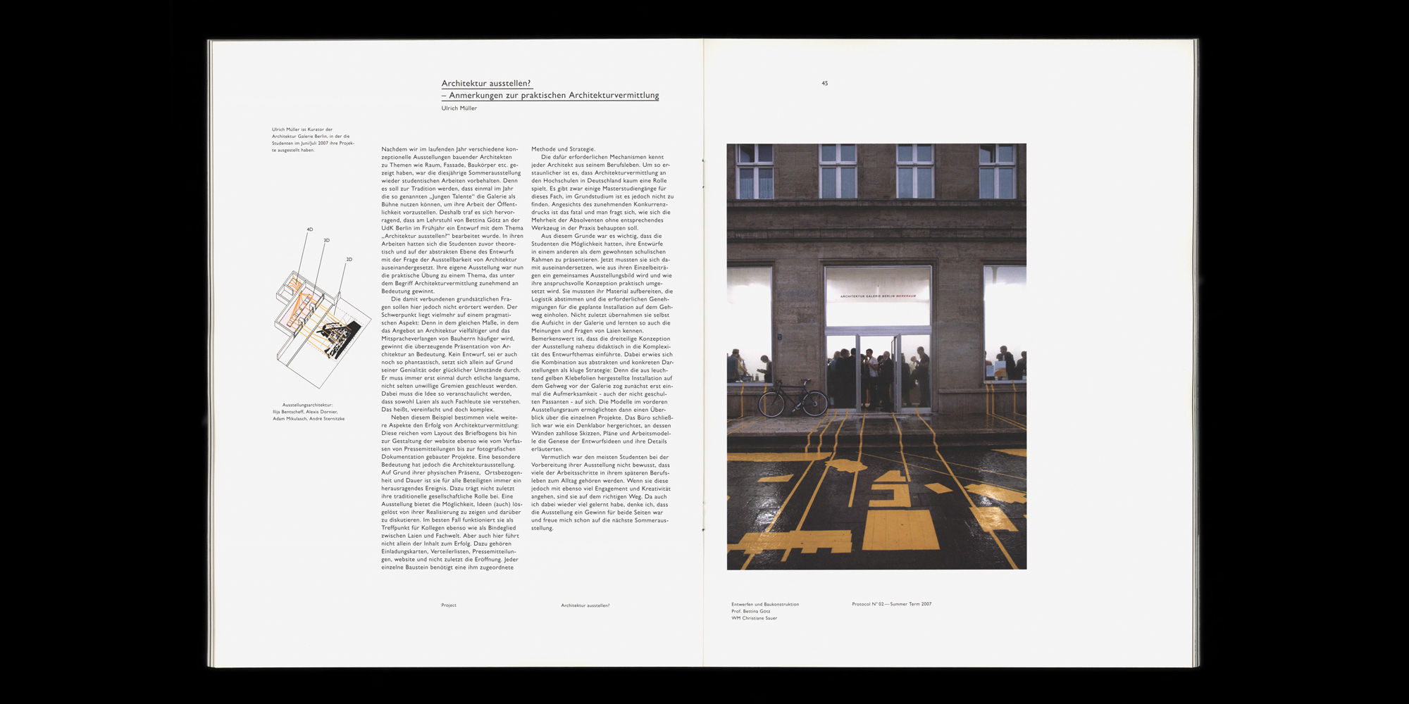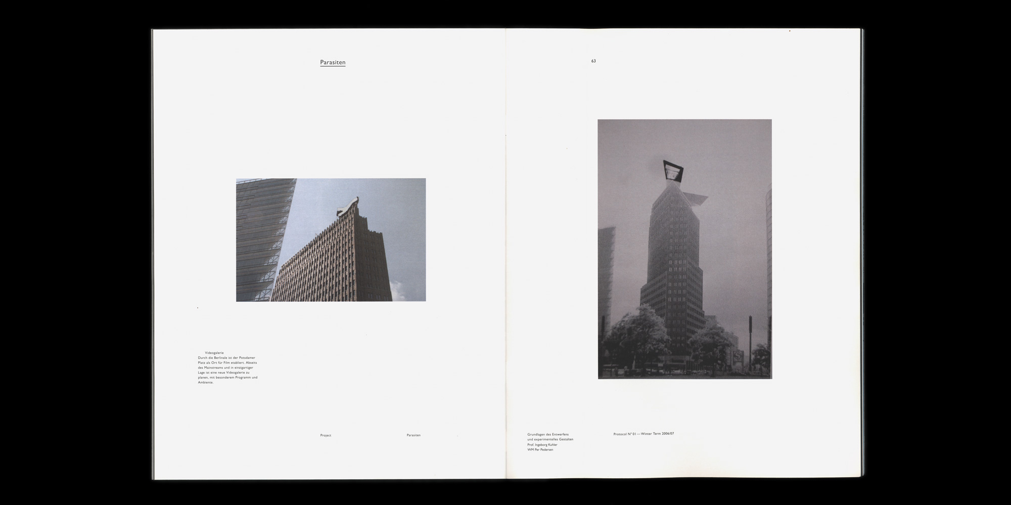Introducing Protocol: ‘Making’ a name for a magazine begins with choosing its direction. Current, Print Out, Probe, Processed, Prospect... Protocol was selected because of the sound and texture of the word. And its multiple connotations seemed appropriate for the new architectural periodical of Berlin University of the Arts. The word is usually associated with the term ‘convention’ or the objective act of documenting and, insofar as this publication covers issues in and around an architecture department, it conforms to that definition. At the same time documenting implies perceiving, questioning, reading – particularly when the subject at hand is connected to inventive and intellectual pursuits. This ambivalence is reflected in the magazine’s ‘disposition’. Protocol is in fact a loosely erdered compendium of ideas circulating among the students, of input and output processed, but also of catalysing contributions from teachers, guest critics and lecturers. The running order suggested on the cover, which of course nobody is obliged to follow, gives a catalogue or record of significant occurrences. There are travellers’ tales vis-à-vis urban criticism, theoretical essays alongside absorbing work reports and diverting interviews, projects with a vague relationship to reality versus genuinely feasible construction proposals, and high-end images augment photographic series in which awkward models take on a bohemian beauty. The ‘otherness’ of approaches affords a blend of insights and once in a while a shift in perspective. More than just a double-take, Protocol provides a framewerk for up-and-coming architects, designers and writers to take a place between established practitioners and critics. As an ink-and-paper test bed, it has to remain crisp only until the next issue is released.