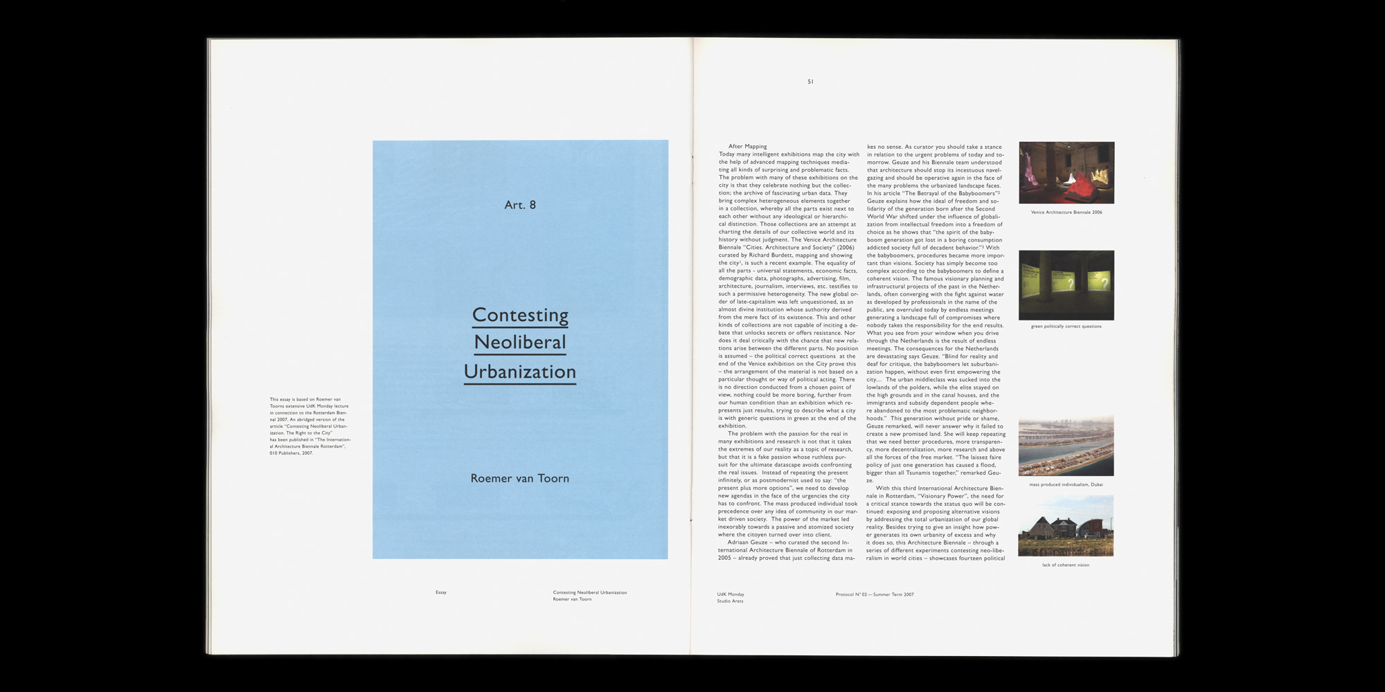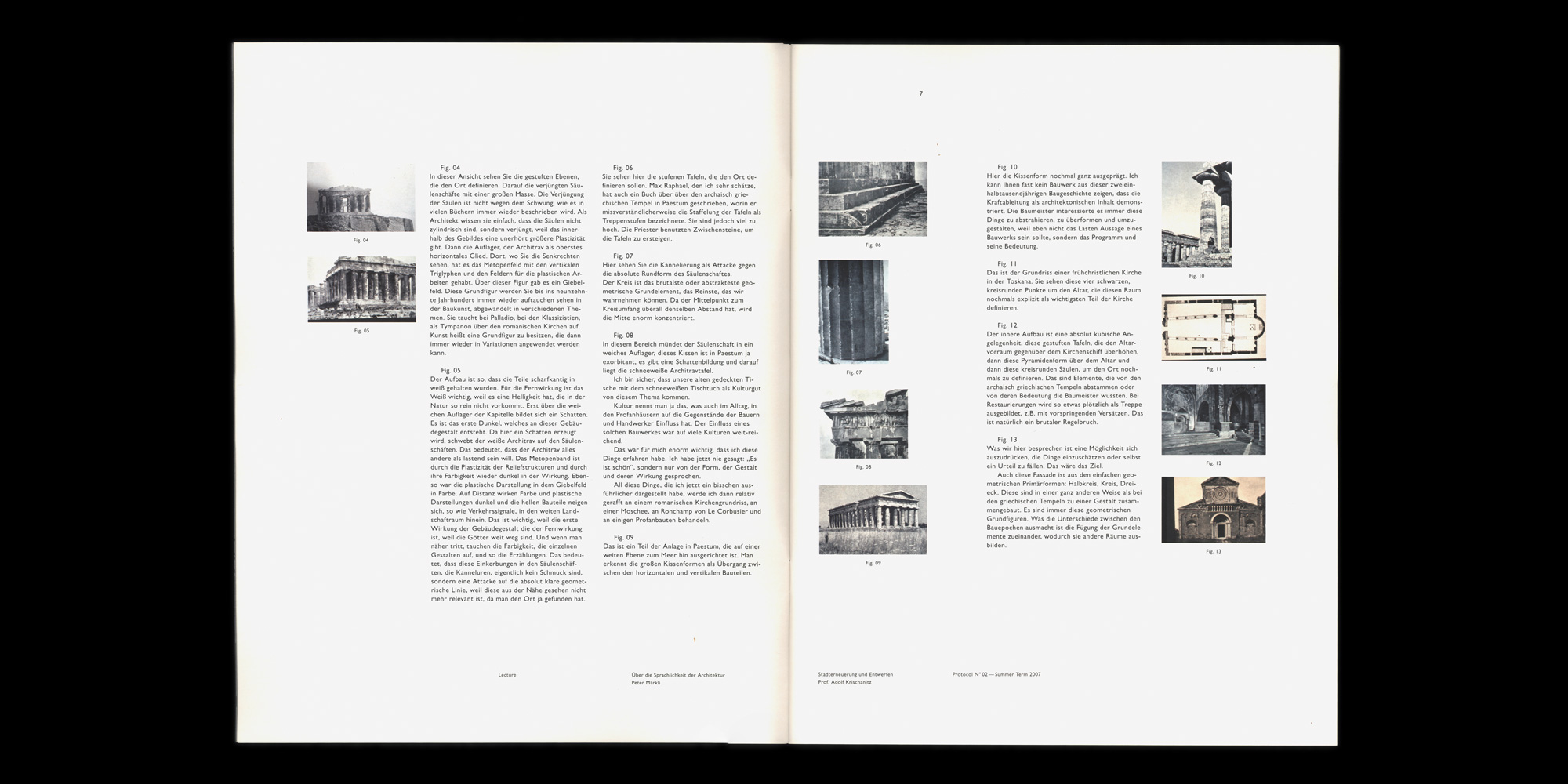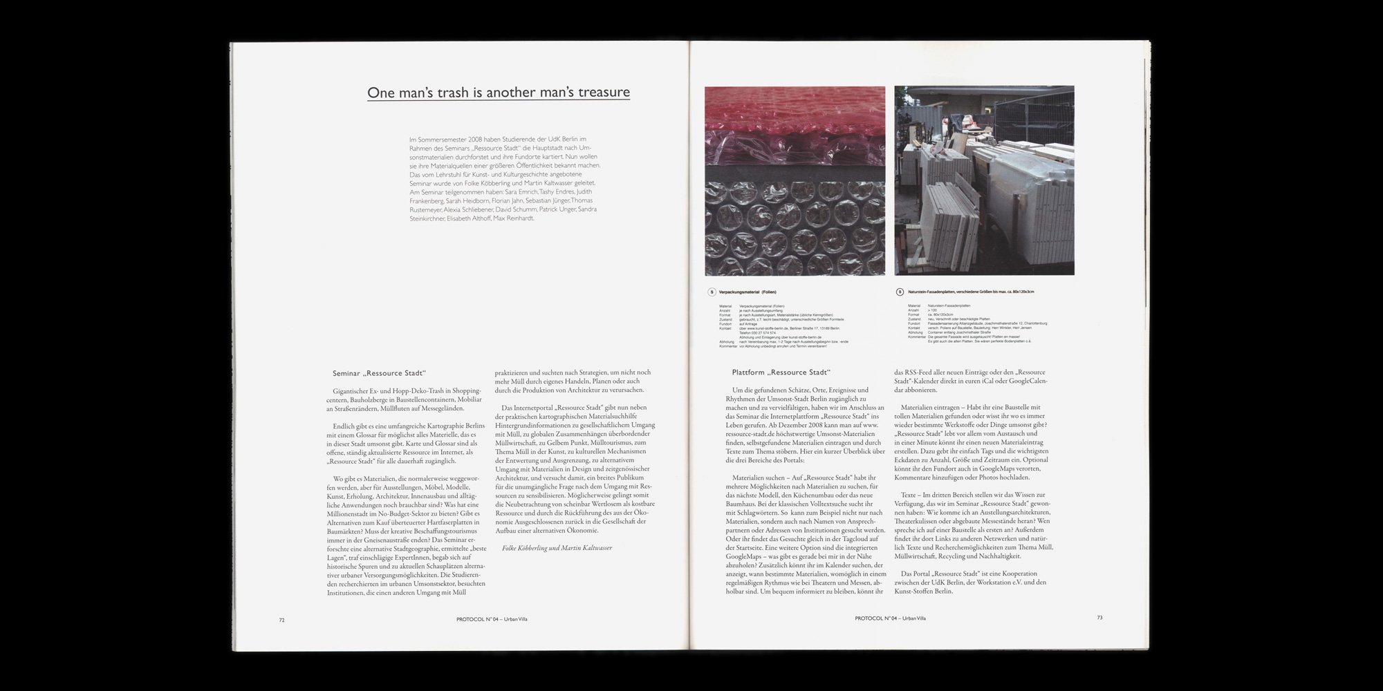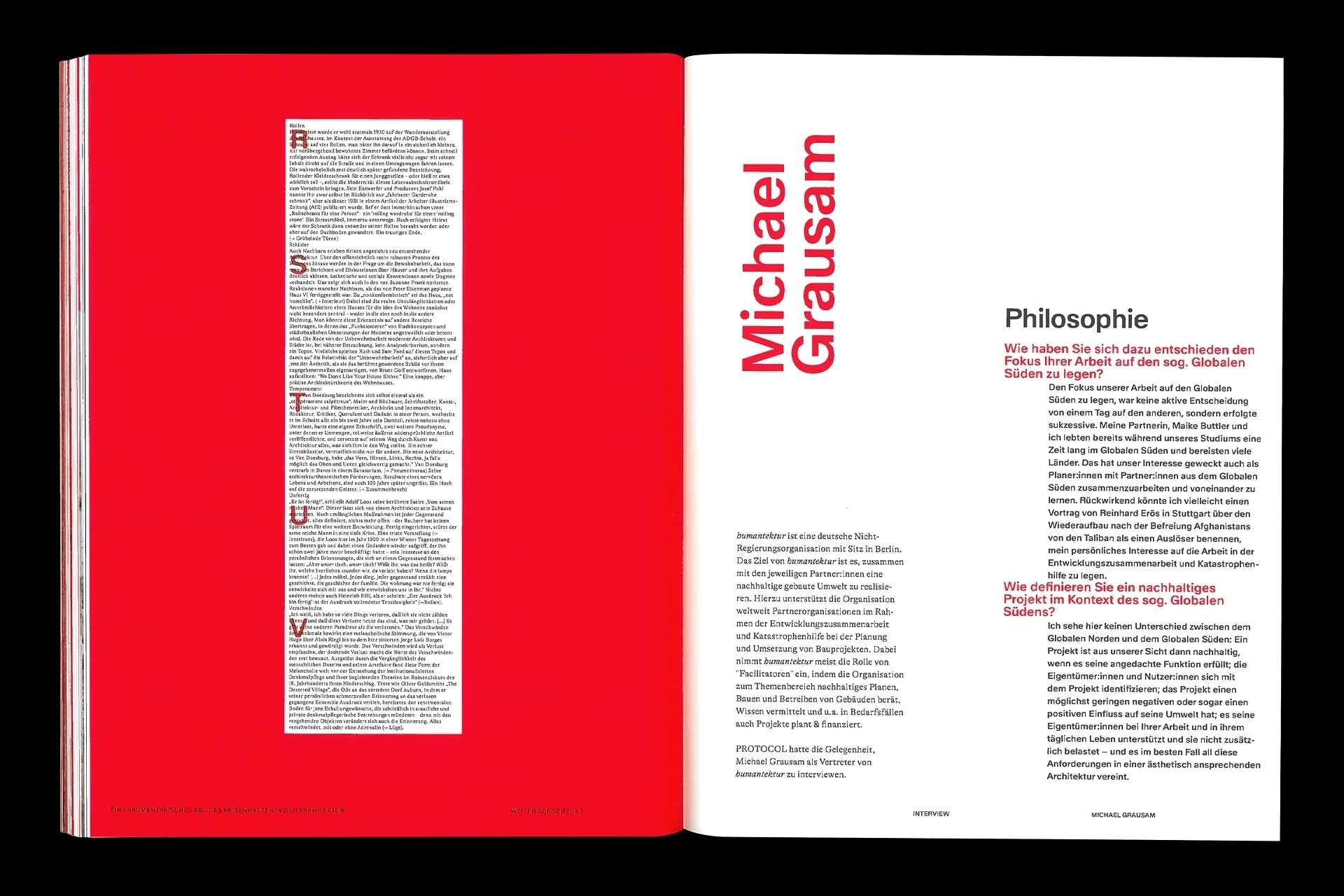 Introducing Protocol: ‘Making’ a name for a magazine begins with choosing its direction. Current, Print Out, Probe, Processed, Prospect... Protocol was selected because of the sound and texture of the word. And its multiple connotations seemed appropriate for the new architectural periodical of Berlin University of the Arts. The word is usually associated with the term ‘convention’ or the objective act of documenting and, insofar as this publication covers issues in and around an architecture department, it conforms to that definition. At the same time documenting implies perceiving, questioning, reading – particularly when the subject at hand is connected to inventive and intellectual pursuits. This ambivalence is reflected in the magazine’s ‘disposition’. Protocol is in fact a loosely erdered compendium of ideas circulating among the students, of input and output processed, but also of catalysing contributions from teachers, guest critics and lecturers. The running order suggested on the cover, which of course nobody is obliged to follow, gives a catalogue or record of significant occurrences. There are travellers’ tales vis-à-vis urban criticism, theoretical essays alongside absorbing work reports and diverting interviews, projects with a vague relationship to reality versus genuinely feasible construction proposals, and high-end images augment photographic series in which awkward models take on a bohemian beauty. The ‘otherness’ of approaches affords a blend of insights and once in a while a shift in perspective. More than just a double-take, Protocol provides a framewerk for up-and-coming architects, designers and writers to take a place between established practitioners and critics. As an ink-and-paper test bed, it has to remain crisp only until the next issue is released.