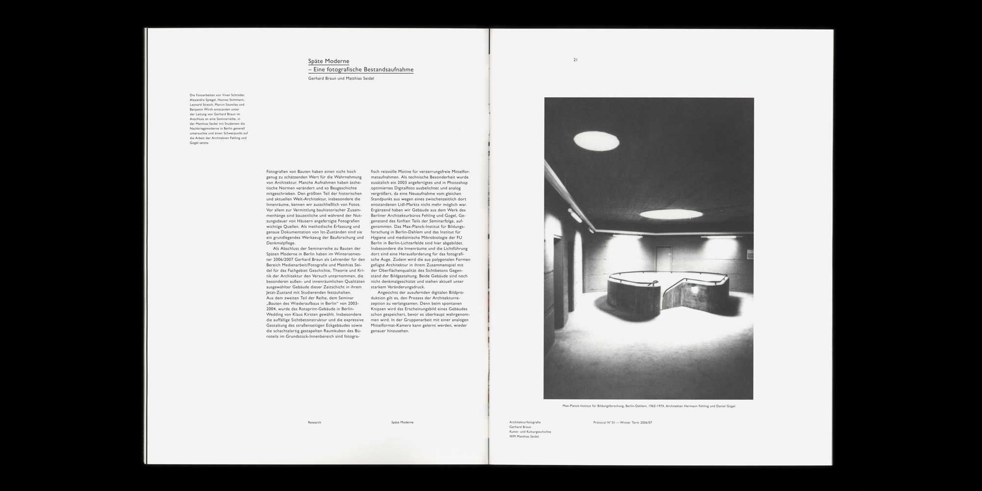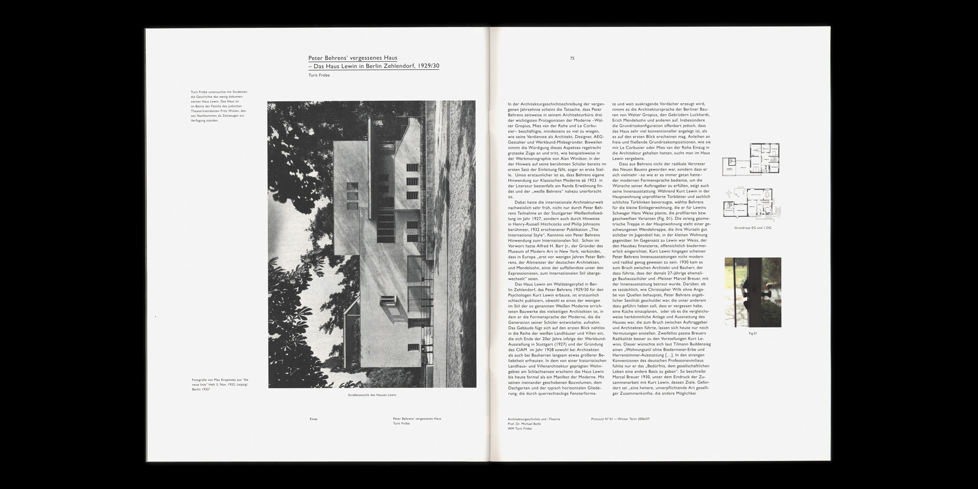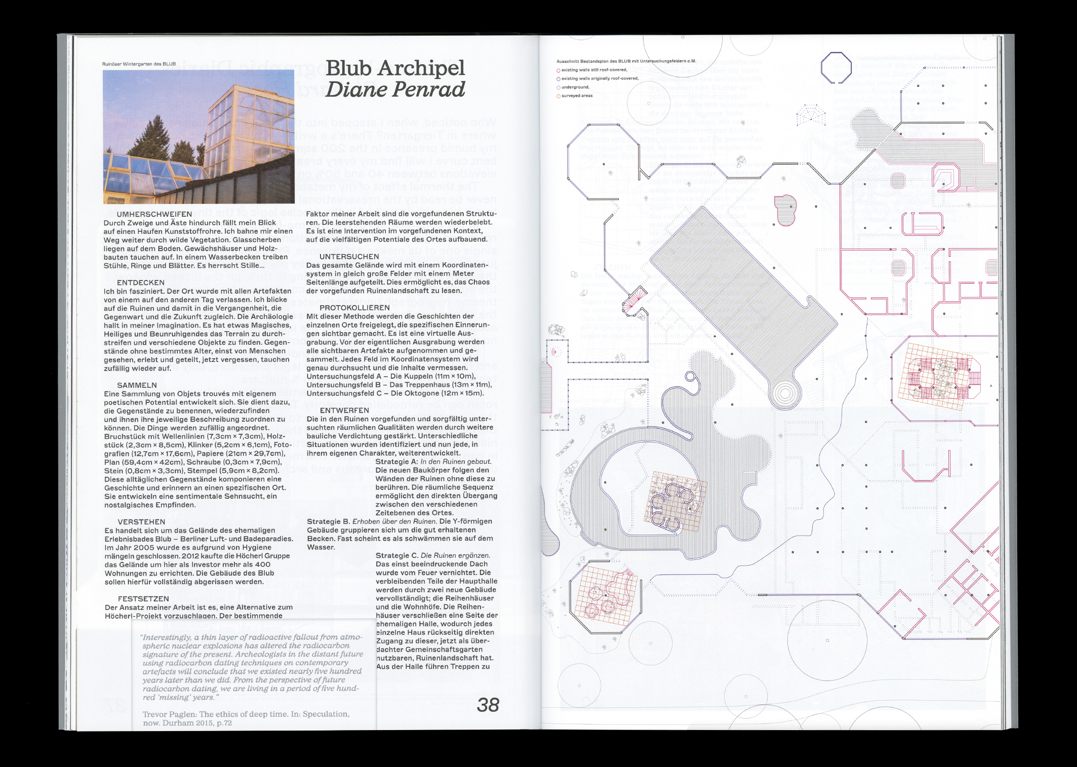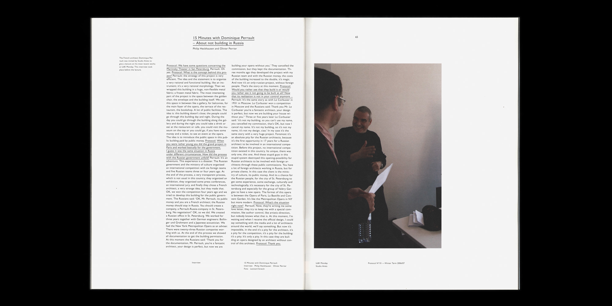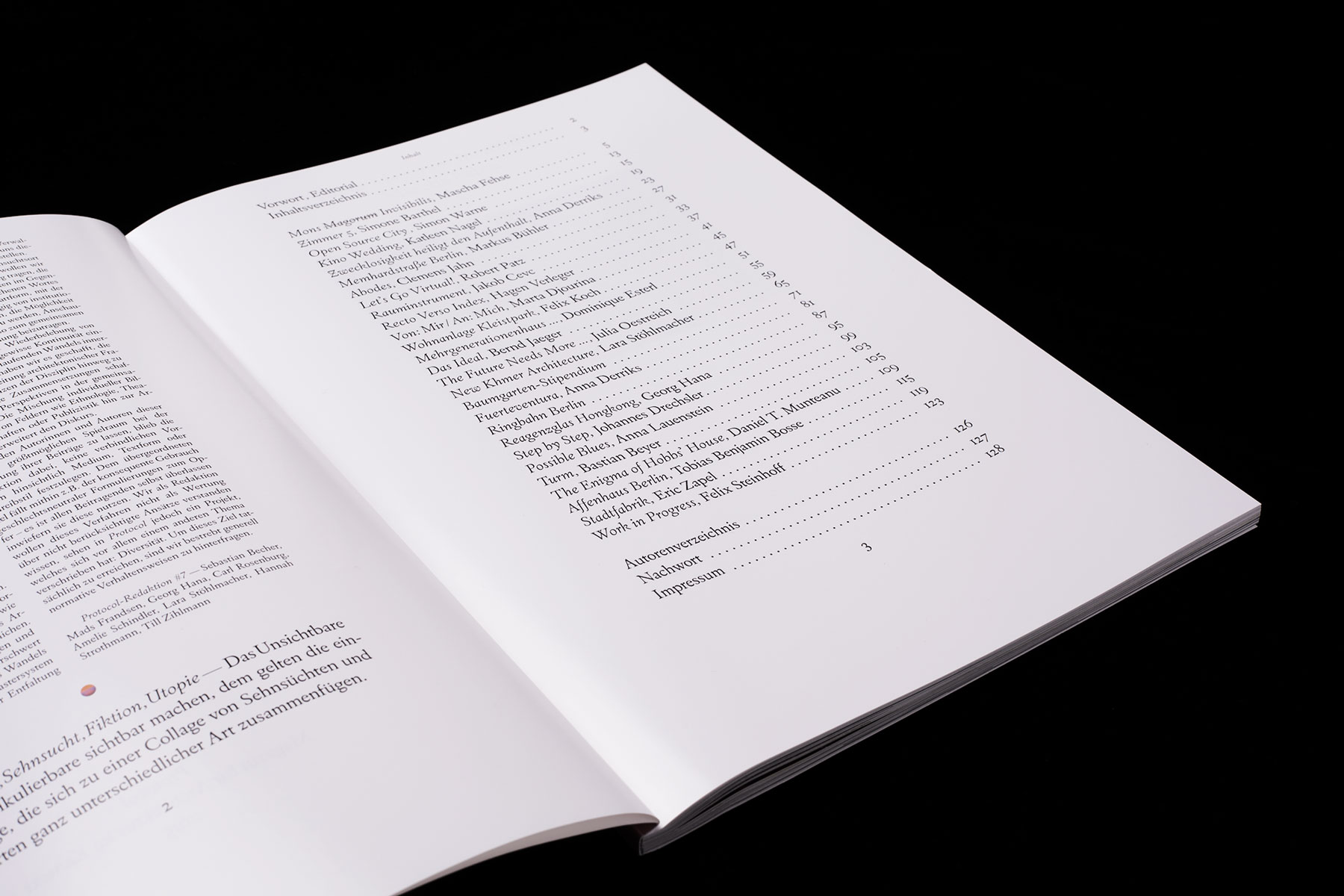 Introducing Protocol: ‘Making’ a name for a magazine begins with choosing its direction. Current, Print Out, Probe, Processed, Prospect... Protocol was selected because of the sound and texture of the word. And its multiple connotations seemed appropriate for the new architectural periodical of Berlin University of the Arts. The word is usually associated with the term ‘convention’ or the objective act of documenting and, insofar as this publication covers issues in and around an architecture department, it conforms to that definition. At the same time documenting implies perceiving, questioning, reading – particularly when the subject at hand is connected to inventive and intellectual pursuits. This ambivalence is reflected in the magazine’s ‘disposition’. Protocol is in fact a loosely erdered compendium of ideas circulating among the students, of input and output processed, but also of catalysing contributions from teachers, guest critics and lecturers. The running order suggested on the cover, which of course nobody is obliged to follow, gives a catalogue or record of significant occurrences. There are travellers’ tales vis-à-vis urban criticism, theoretical essays alongside absorbing work reports and diverting interviews, projects with a vague relationship to reality versus genuinely feasible construction proposals, and high-end images augment photographic series in which awkward models take on a bohemian beauty. The ‘otherness’ of approaches affords a blend of insights and once in a while a shift in perspective. More than just a double-take, Protocol provides a framewerk for up-and-coming architects, designers and writers to take a place between established practitioners and critics. As an ink-and-paper test bed, it has to remain crisp only until the next issue is released.