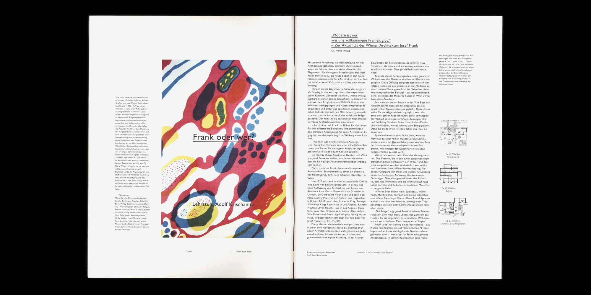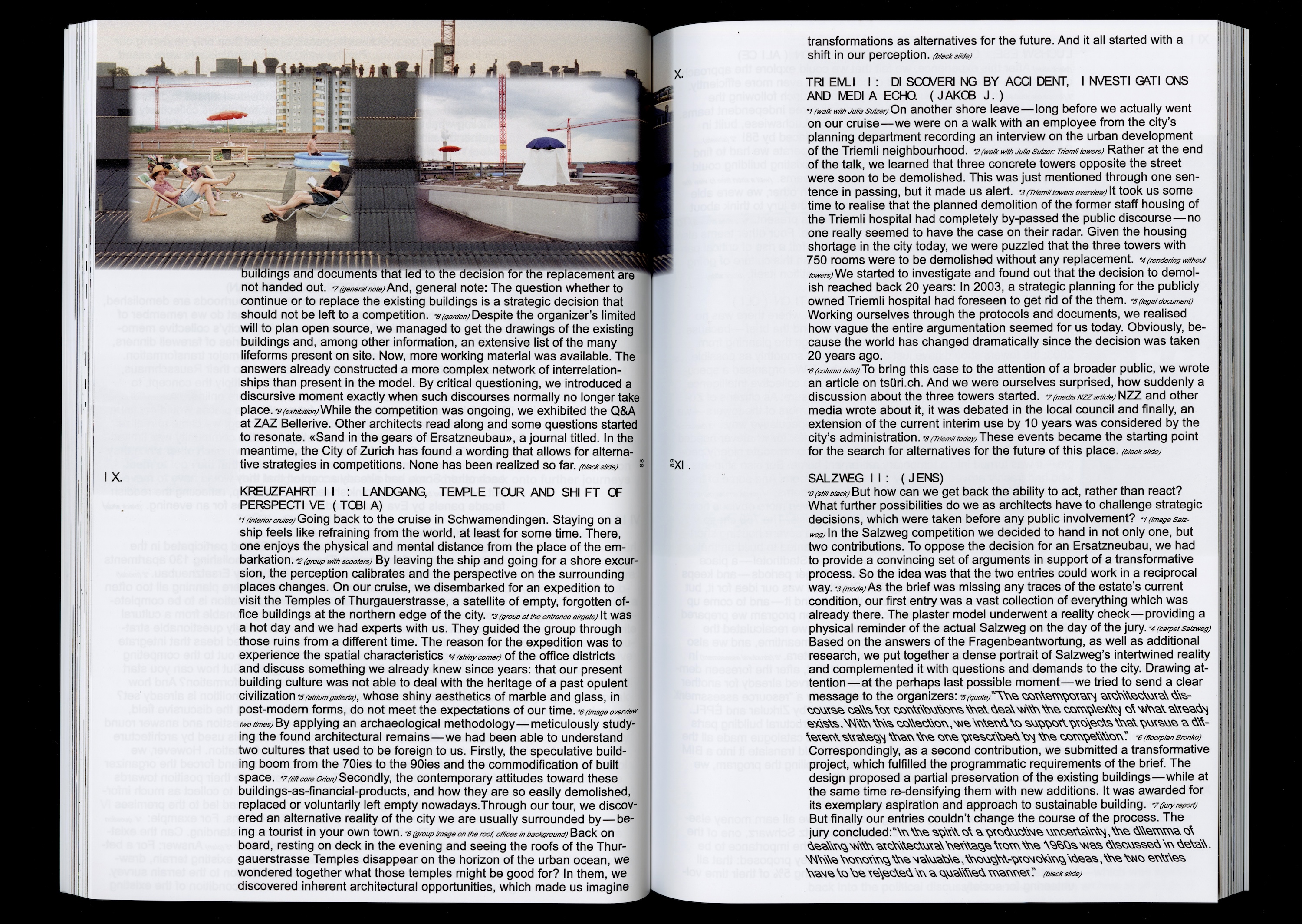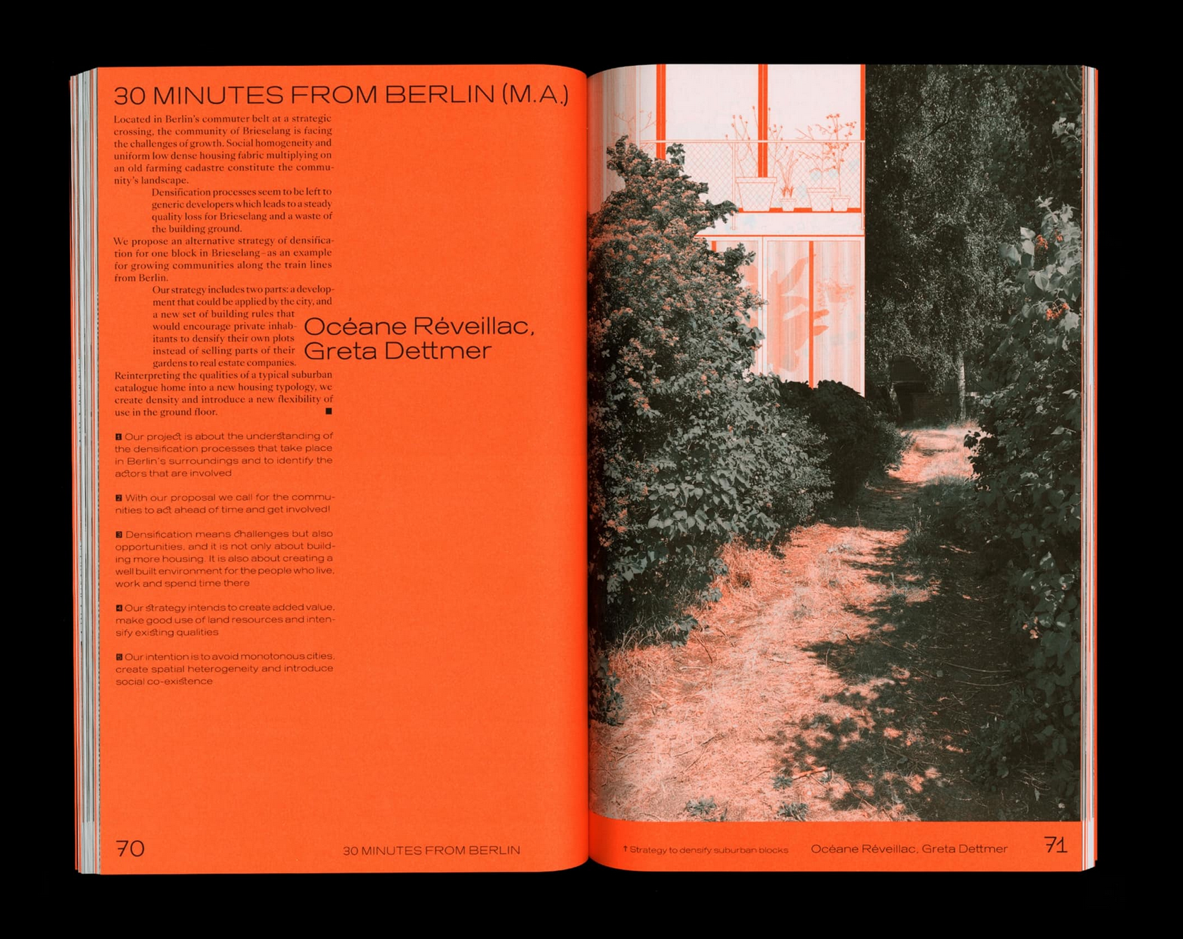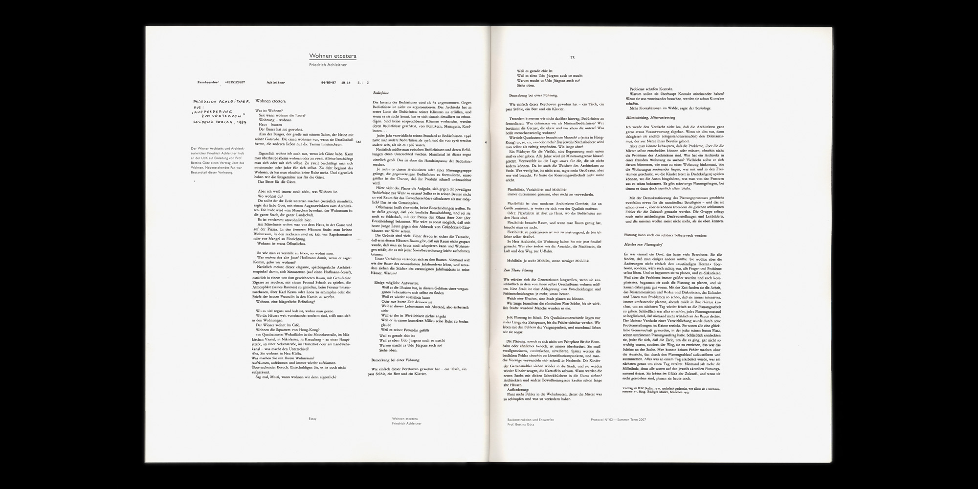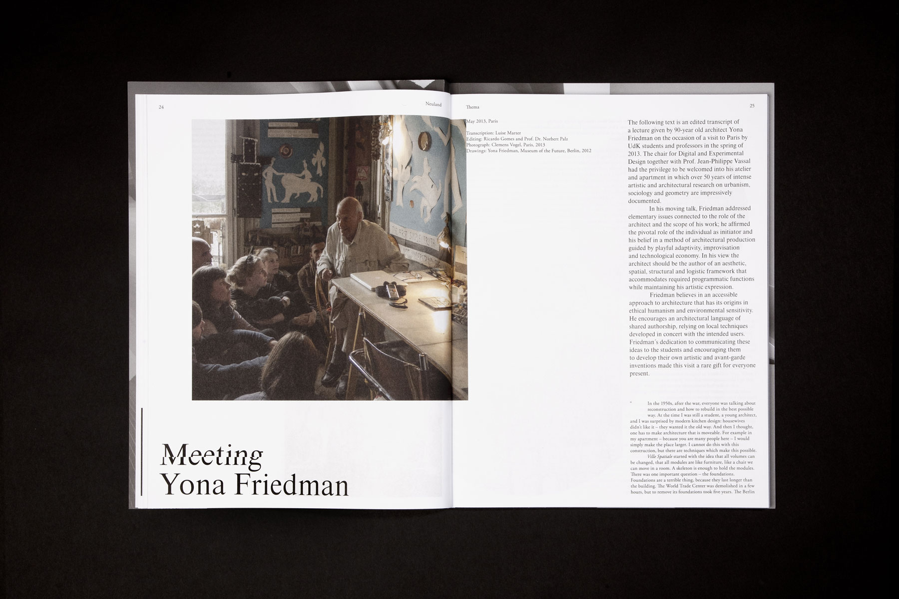 Introducing Protocol: ‘Making’ a name for a magazine begins with choosing its direction. Current, Print Out, Probe, Processed, Prospect... Protocol was selected because of the sound and texture of the word. And its multiple connotations seemed appropriate for the new architectural periodical of Berlin University of the Arts. The word is usually associated with the term ‘convention’ or the objective act of documenting and, insofar as this publication covers issues in and around an architecture department, it conforms to that definition. At the same time documenting implies perceiving, questioning, reading – particularly when the subject at hand is connected to inventive and intellectual pursuits. This ambivalence is reflected in the magazine’s ‘disposition’. Protocol is in fact a loosely erdered compendium of ideas circulating among the students, of input and output processed, but also of catalysing contributions from teachers, guest critics and lecturers. The running order suggested on the cover, which of course nobody is obliged to follow, gives a catalogue or record of significant occurrences. There are travellers’ tales vis-à-vis urban criticism, theoretical essays alongside absorbing work reports and diverting interviews, projects with a vague relationship to reality versus genuinely feasible construction proposals, and high-end images augment photographic series in which awkward models take on a bohemian beauty. The ‘otherness’ of approaches affords a blend of insights and once in a while a shift in perspective. More than just a double-take, Protocol provides a framewerk for up-and-coming architects, designers and writers to take a place between established practitioners and critics. As an ink-and-paper test bed, it has to remain crisp only until the next issue is released.