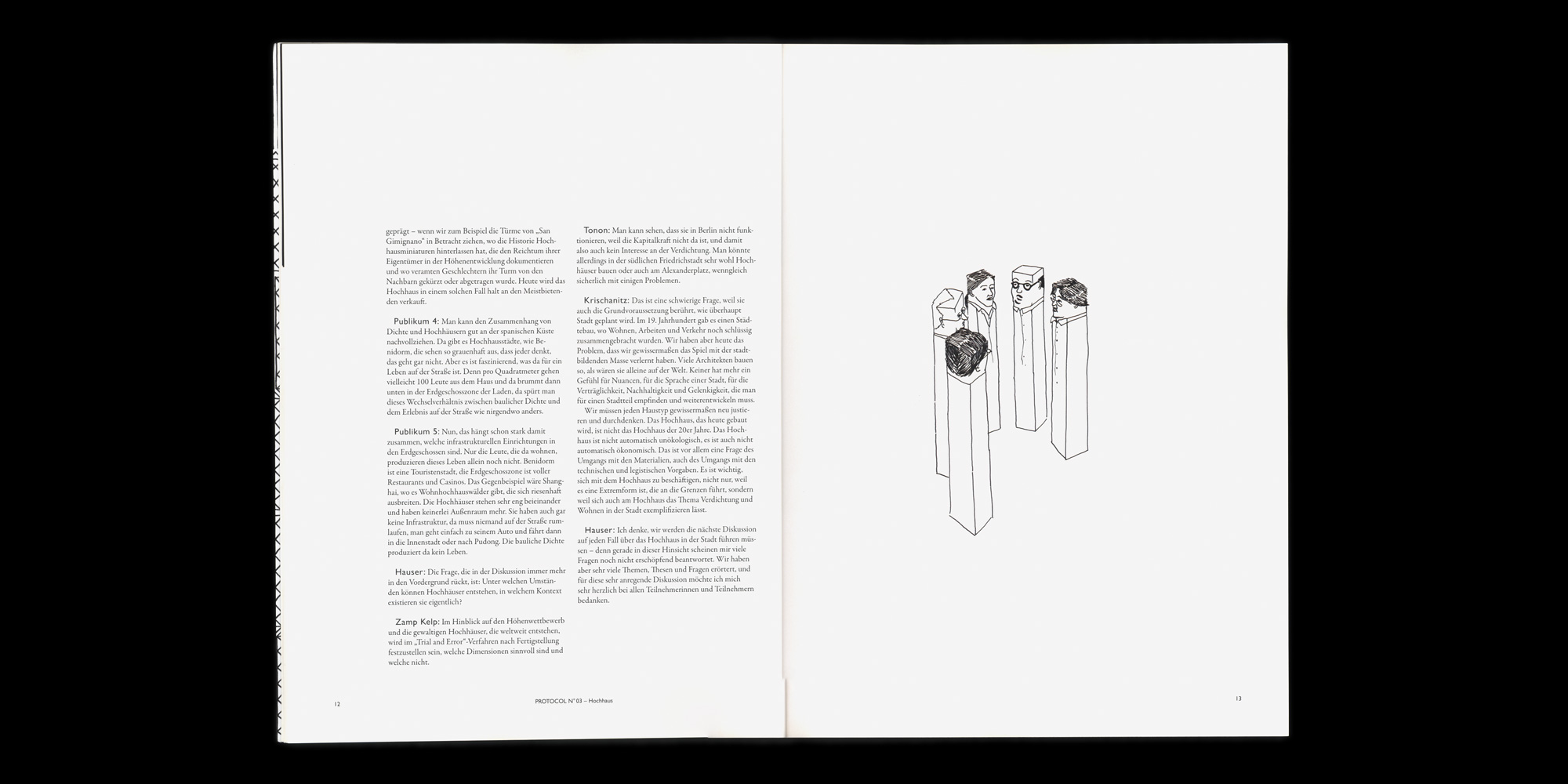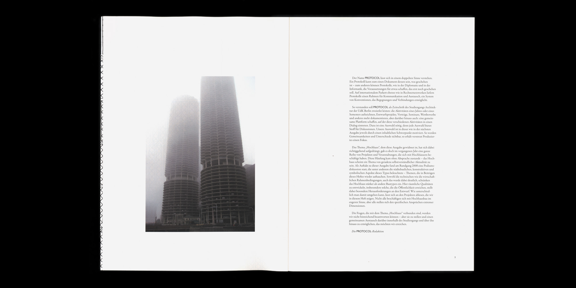 Als Auftakt dieser Ausgabe fand am Rundgang 2008 eine Podiumsdiskussion statt, die unter anderem die städtebaulichen, konstruktiven und symbolischen Aspekte dieses Typus beleuchtete – Themen, die in Beiträgen dieses Heftes wieder auftauchen. Sowohl die technischen als auch die wirtschaftlichen Rahmenbedingungen, auch das wurde dabei deutlich, schränken das Hochhaus anders als andere Bautypen ein. Hier räumliche Qualitäten zu entwickeln, insbesondere solche, die die Öffentlichkeit erreichen, stellt daher besondere Herausforderungen an den Entwurf. Wie unterschiedlich man damit umgehen kann, lässt sich an den Projekten ablesen, die wie in diesem Heft zeigen. Nicht alle beschäftigen sich mit Hochhausbau im engeren Sinne, aber alle stellen sich den spezifischen Ansprüchen extremer Dimensionen. Die Fragen, die mit dem Thema ‚Hochhaus‘ verbunden sind, werden wir nicht hinreichend beantworten können – aber sie zu stellen und einen gemeinsamen Austausch darüber innerhalb des Studiengangs und über ihn hinaus zu ermöglichen, das möchten wir erreichen. Der Name Protocol lässt sich in einem doppelten Sinne verstehen. Ein Protokoll kann zum einen Dokument dessen sein, was geschehen ist – zum anderen können Protokolle, wie in der Diplomatie und in der Informatik, die Voraussetzung für etwas schaffen, das erst noch geschehen soll. Auf internationalem Parkett ebenso wie in Rechnernetzwerken liefern Protokolle einen Rahmen für Kommunikation und Austausch, ein System von Konventionen, das Begegnung und Verbindung ermöglicht. So verstanden soll Protocol als Zeitschrift des Studiengangs Architektur der UdK Berlin zweierlei leisten: die Aktivitäten eines Jahres oder eines Semesters aufzeichnen, Entwurfsprojekte, Vorträge, Seminare, Wettbewerbe und anderes mehr dokumentieren, aber darüber hinaus auch: eine gemeinsame Plattform schaffen, auf der diese verschiedenen Aktivitäten in einen Dialog eintreten. Dazu ist eine Auswahl nötig, denn jede Auswahl bietet Stoff für Diskussionen. Unsere Auswahl ist in dieser wie in der nächsten Ausgabe jeweils durch einen inhaltlichen Schwerpunkt motiviert. So werden Gemeinsamkeiten und Unterschiede sichtbar, so erhält verstreut Produziertes einen Fokus. Das Thema ‚Hochhaus‘, dem diese Ausgabe gewidmet ist, hat sich dabei richtiggehend aufgedrängt, gab es doch im vergangenen Jahr eine ganze Reihe von Projekten und Veranstaltungen, die sich mit Hochhäusern beschäftigt haben. Diese Häufung kam ohne Absprache zustande – das Hochhaus scheint ein Thema von geradezu selbstverständlicher Aktualität zu sein.