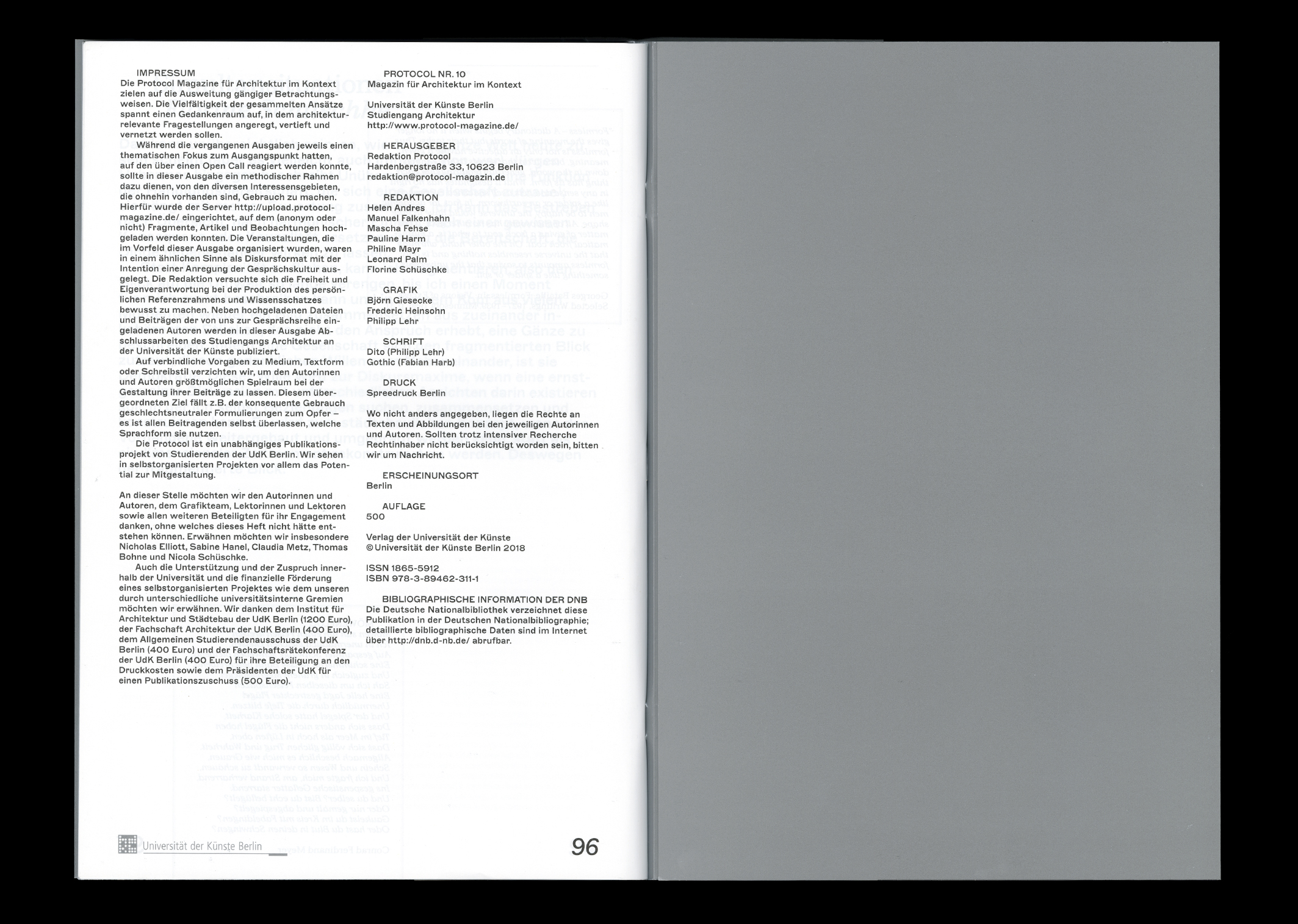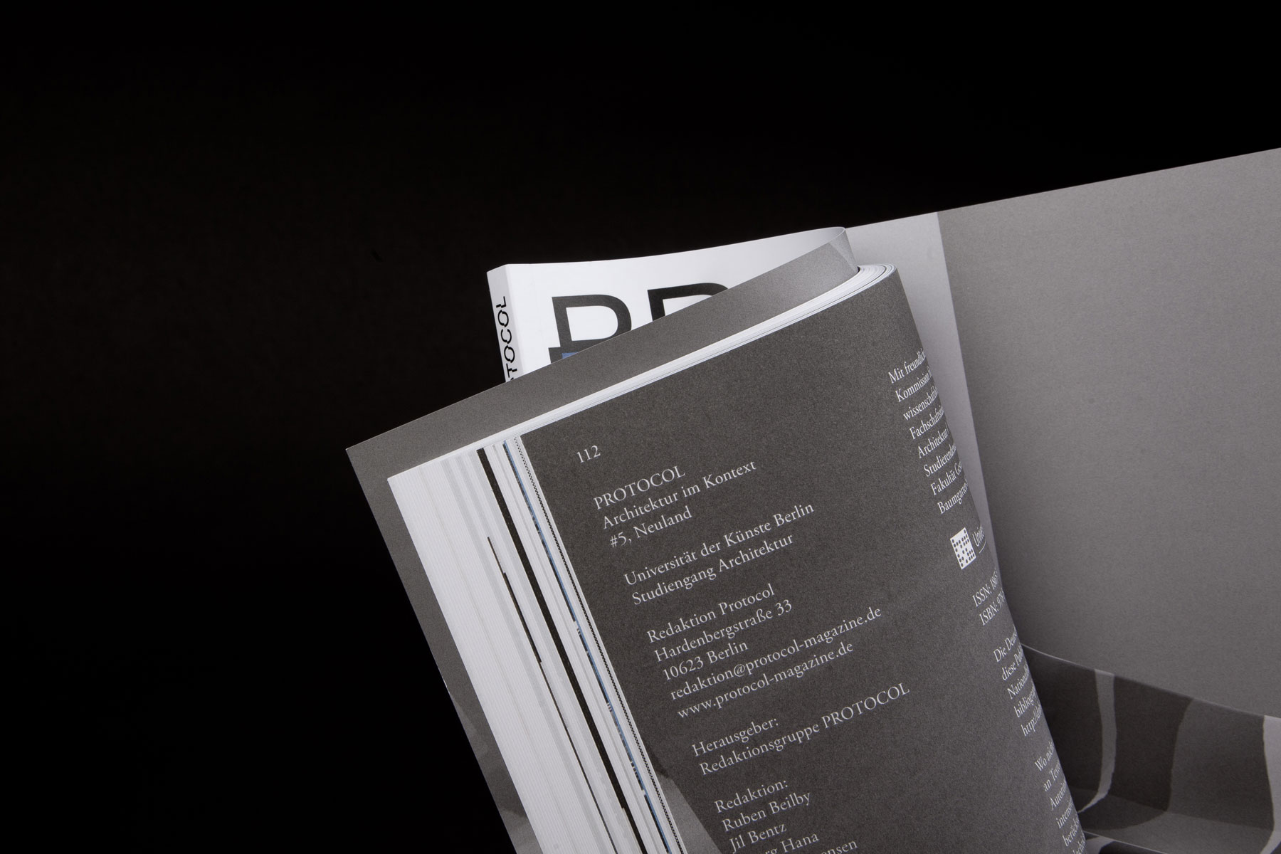Die Protocol ist eine interdisziplinäre und unabhängige Plattform für aktuelle Diskurse rund um das Thema Architektur – frei nach dem Konzept: Architektur im Kontext. Architektur im Kontext – wir als unabhängiges studentisches Magazin – initiiert von Studierenden des Studiengangs Architektur der Universität der Künste Berlin – sind gespannt darauf, wie diesem Kontext durch Beiträge verschiedener Disziplinen Gestalt verliehen wird. Ein Call for Contributions gibt für jedes Heft ein Thema vor, welches mit Bezug zu architekturrelevanten Fragestellungen von allen Interessierten frei bearbeitet und interpretiert werden kann. Architektur im Kontext – innerhalb der UdK und darüber hinaus verstehen wir den Dialog mit anderen Wissensformen und künstlerischen Positionen als Chance.