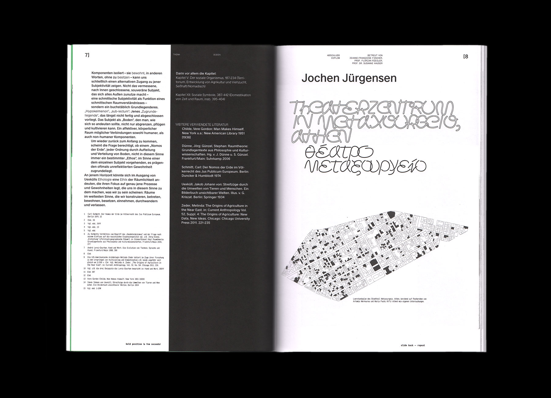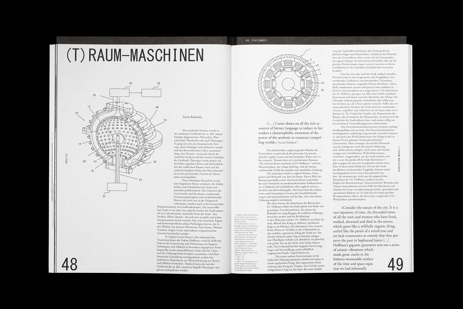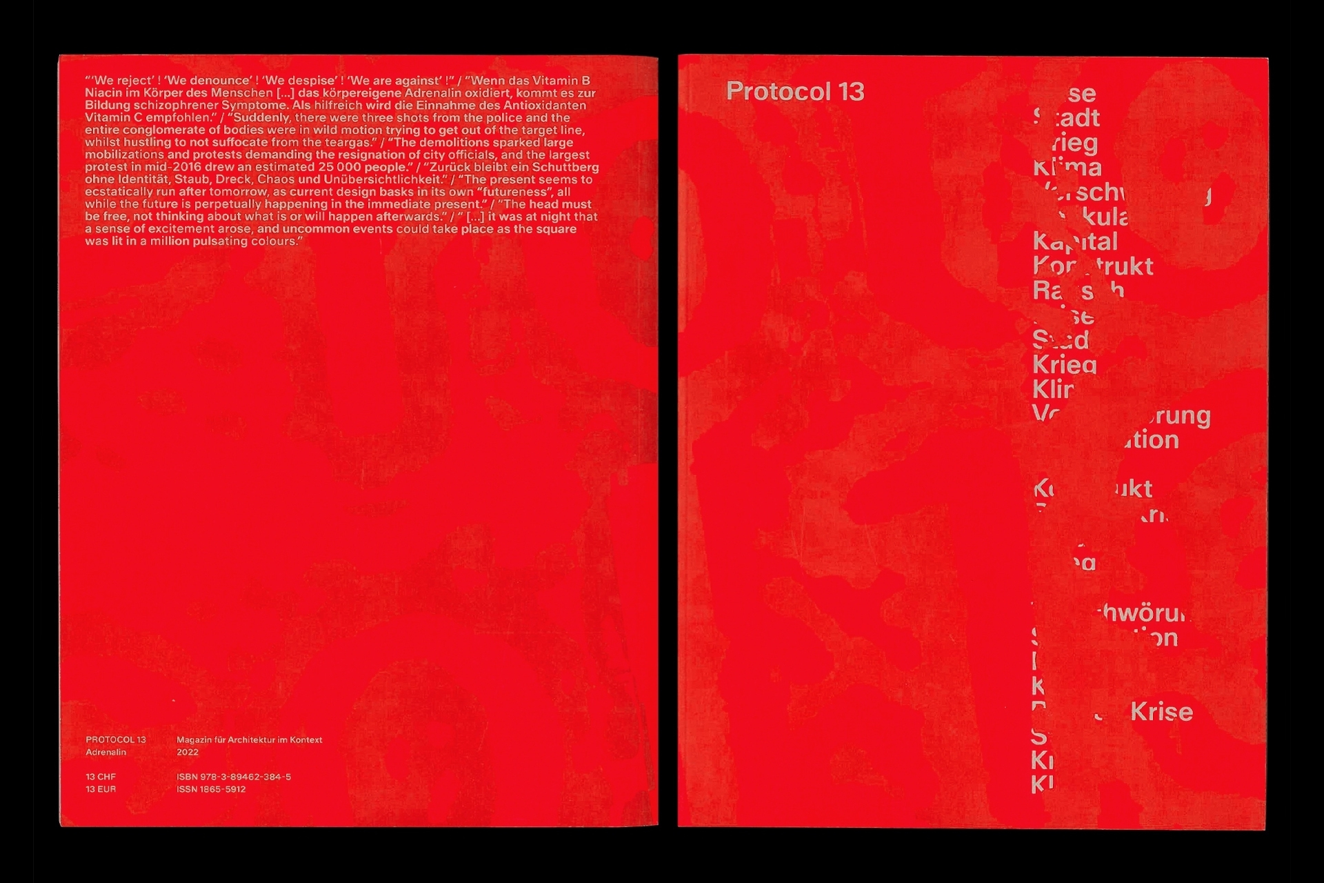 "'We reject' ! 'We denounce' ! 'We despise'! 'We are against'!" / "Wenn das Vitamin B Niacin im Körper des Menschen [.] das körpereigene Adrenalin oxidiert, kommt es zur Bildung schizophrener Symptome. Als hilfreich wird die Einnahme des Antioxidanten Vitamin C empfohlen." | "Suddenly, there were three shots from the police and the entire conglomerate of bodies were in wild motion trying to get out of the target line, whilst hustling to not suffocate from the teargas." / "The demolitions sparked large mobilizations and protests demanding the resignation of city officials, and the largest protest in mid-2016 drew an estimated 25 000 people." / "Zurück bleibt ein Schuttberg ohne Identität, Staub, Dreck, Chaos und Unübersichtlichkeit." / "The present seems to ecstatically run after tomorrow, as current design basks in its own "futureness", all while the future is perpetually happening in the immediate present." /"The head must be free, not thinking about what is or will happen afterwards." /"[.] it was at night that a sense of excitement arose, and uncommon events could take place as the square was lit in a million pulsating colours."