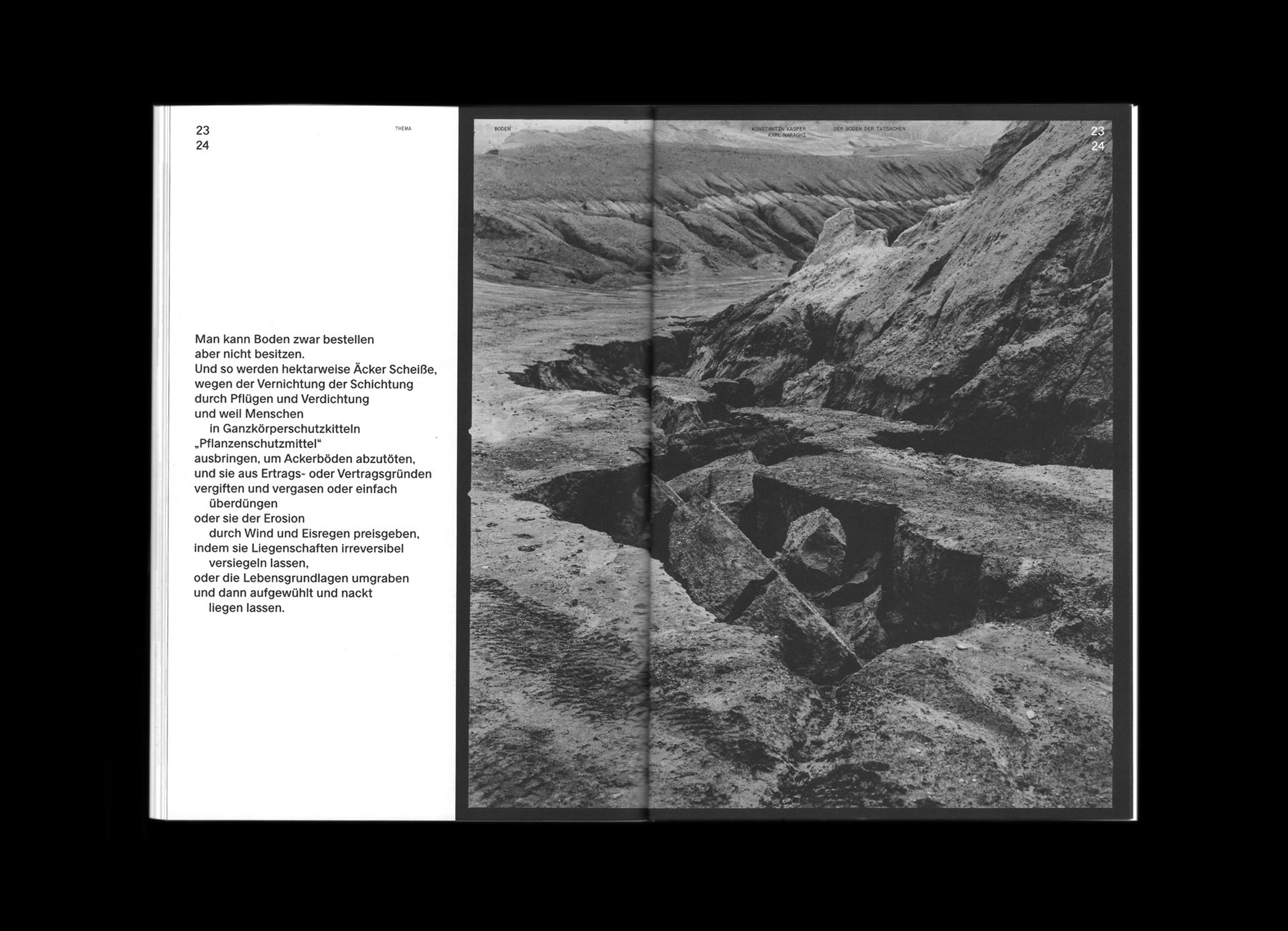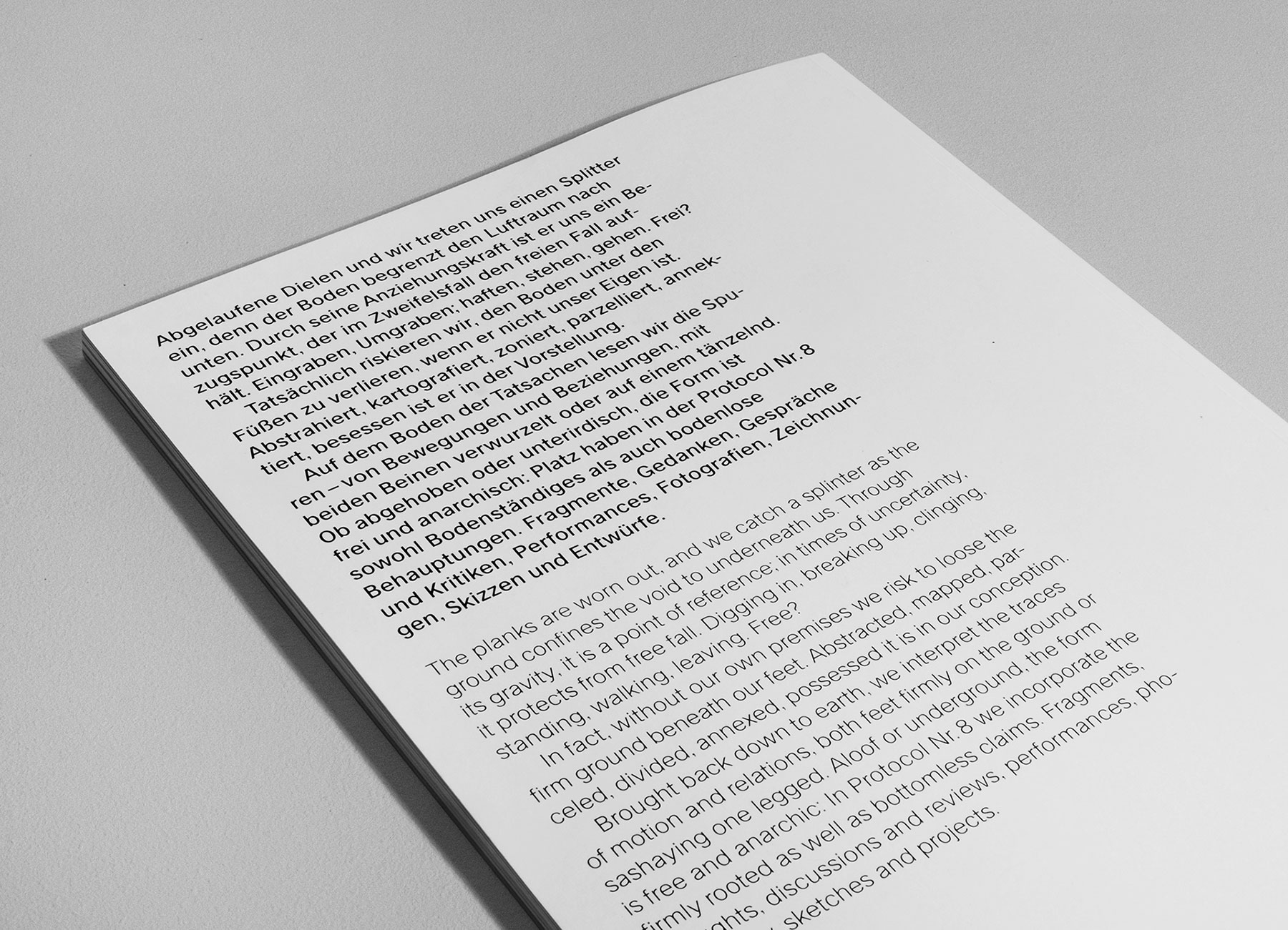 (EN) Ground confines the void to underneath us. Through its gravity, it is a point of reference; in times of uncertainty it protects from free fall. Levity overcomes me once I disengage. Holing up, breaking up, walking, standing, clinging. (For) free? Sowing the seeds–pulling the rug: In fact, without our own premises we risk losing the firm ground beneath our feet. Abstracted, mapped, staked out, parceled, possessed in our conception. Article 14 (2) Basic Law for the Federal Republic of Germany: Property entails obligations. Who said: “There isn’t enough!”? Without trap doors or a safety net: Enough of partitioning earth’s surface with lines, then fences: Plane to line to point, or, after all, the relationship of “the 1st to the Third World”?—Escape, groundlessness. Do we really hope to find just another life-preserving layer underneath the one we’ve exhausted? Conditional, conceited appear our values claiming a prerogative. Isn’t there a common ground feeding our worldview? Or do we live on different earths? What is left when the belief in a false floor is pulled out from underneath? Down to earth: The planks are worn out, and we catch a splinter. Brought back down to earth, we interpret the traces of motion and relations, both feet firmly on the ground or on one leg. Either aloof or underground, we incorporate the firmly rooted as well as bottomless claims. Protocol is looking for contributions from the wider fields of Architecture, Arts and Theory. The form can be free and anarchic. Anything between the scientific and the polemic is desired: Essays, fragments, poems, reports, critiques or conversations, symphonies, photography, drawings, drafts, sketches or designs. We are looking forward to your ideas!