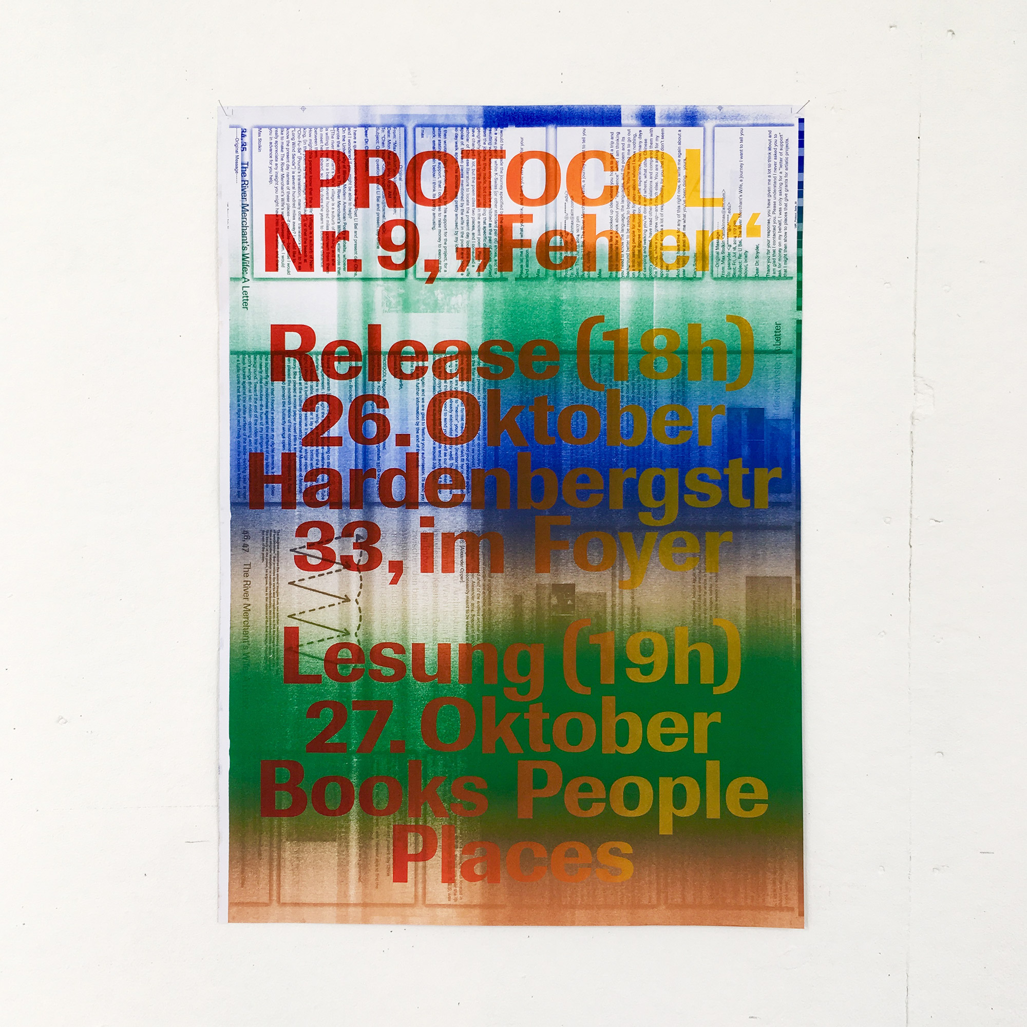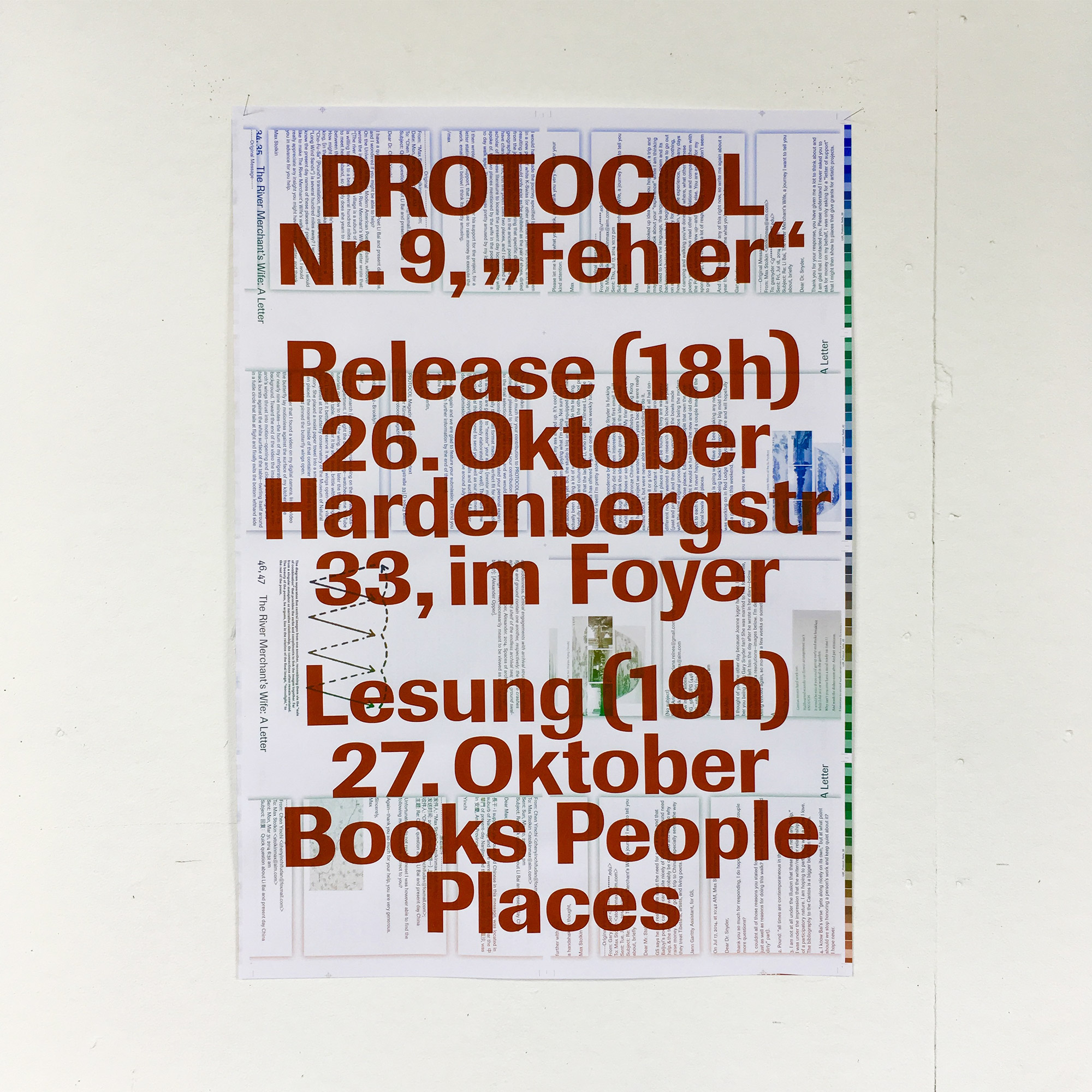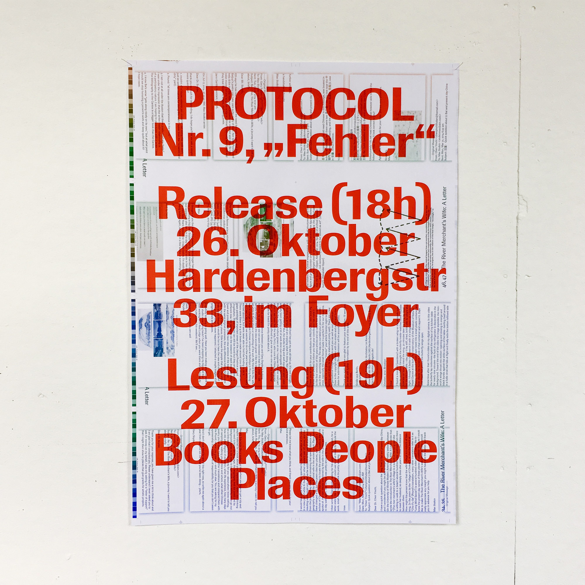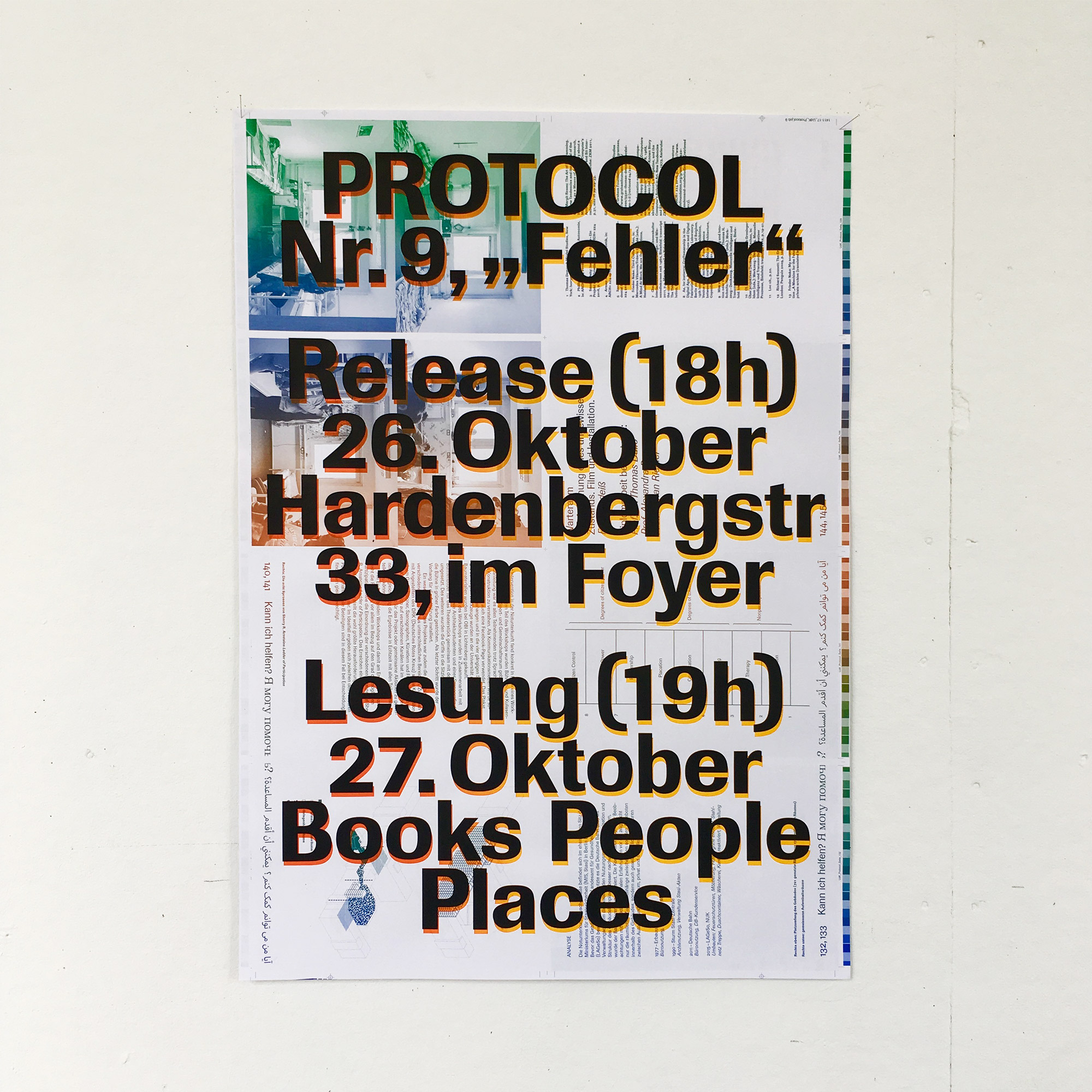 (DE) Die Protocol Nr.9: Die aktuelle Ausgabe versammelt eine Reihe an Arbeiten und Artikel rund um das Thema „Fehler“. Wir wollen das Hinterfragen von vermeintlich fehlerhaften Situationen als Potential betrachten, als Moment begreifen, in dem sich ein Möglichkeitsraum auftut. In diesem Sinne möchten wir euch alle herzlich zu unseren zwei Veranstaltungen im Zuge der Veröffentlichung einladen: Donnerstag, den 26. Oktober 2016, um 18 Uhr – Release-Party im Foyer des Hauptgebäudes der Universität der Künste (Hardenbergstr. 33, 10623 Berlin). Werft einen Blick in die neue Ausgabe und feiert mit uns! Samstag, den 28. Oktober, um 19 Uhr – Lesung bei BooksPeoplePlaces in der Kulmer Str. 20A in 10783 Berlin. Wir werden dort das Magazin und das Projekt Protocol vorstellen. Außerdem freuen wir uns auf unsere Autorinnen und Autoren, die dort aus ihren Artikeln lesen werden. Schaut vorbei und diskutiert mit uns!