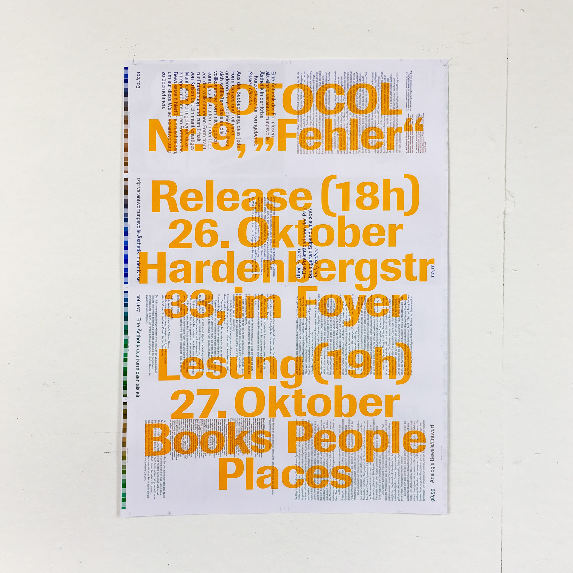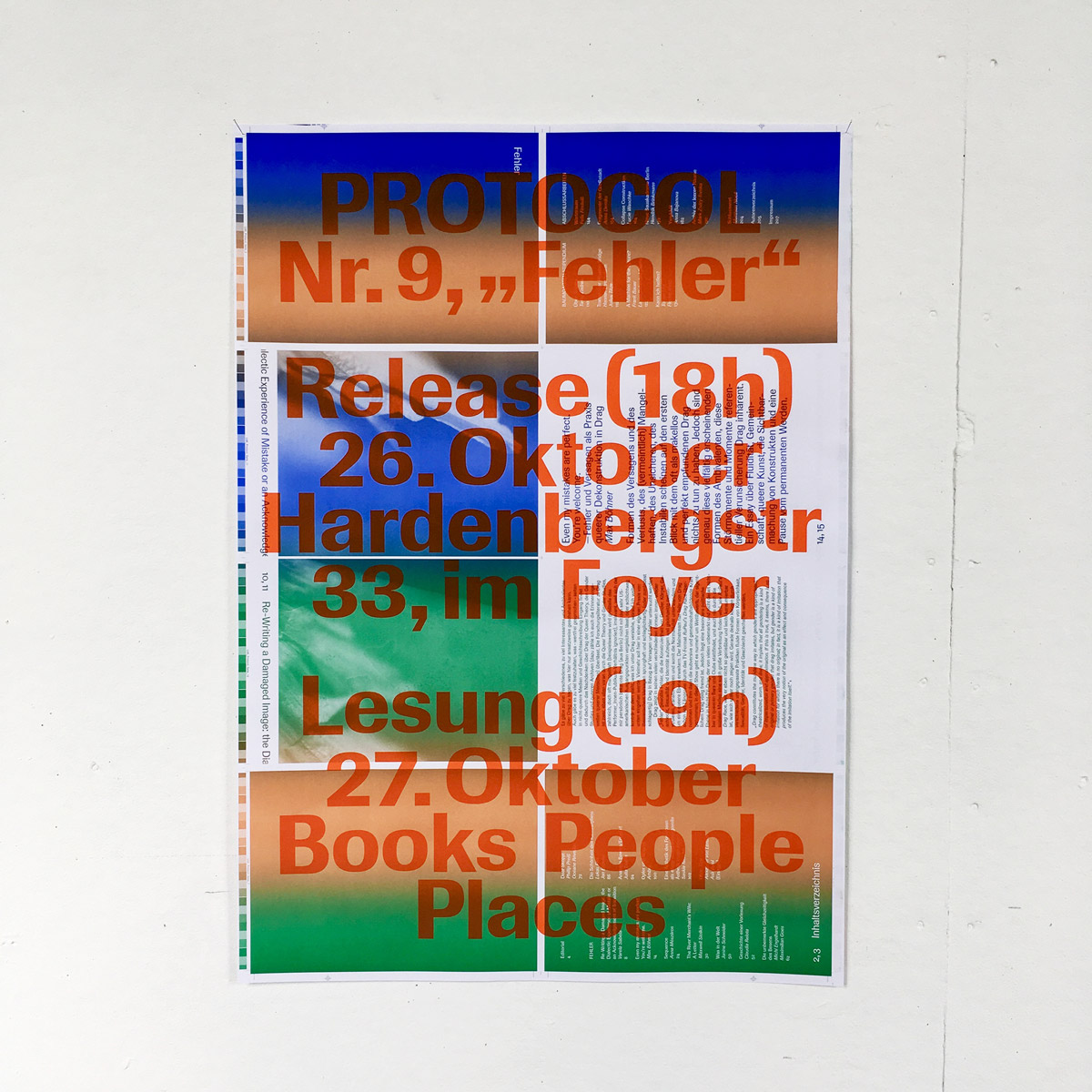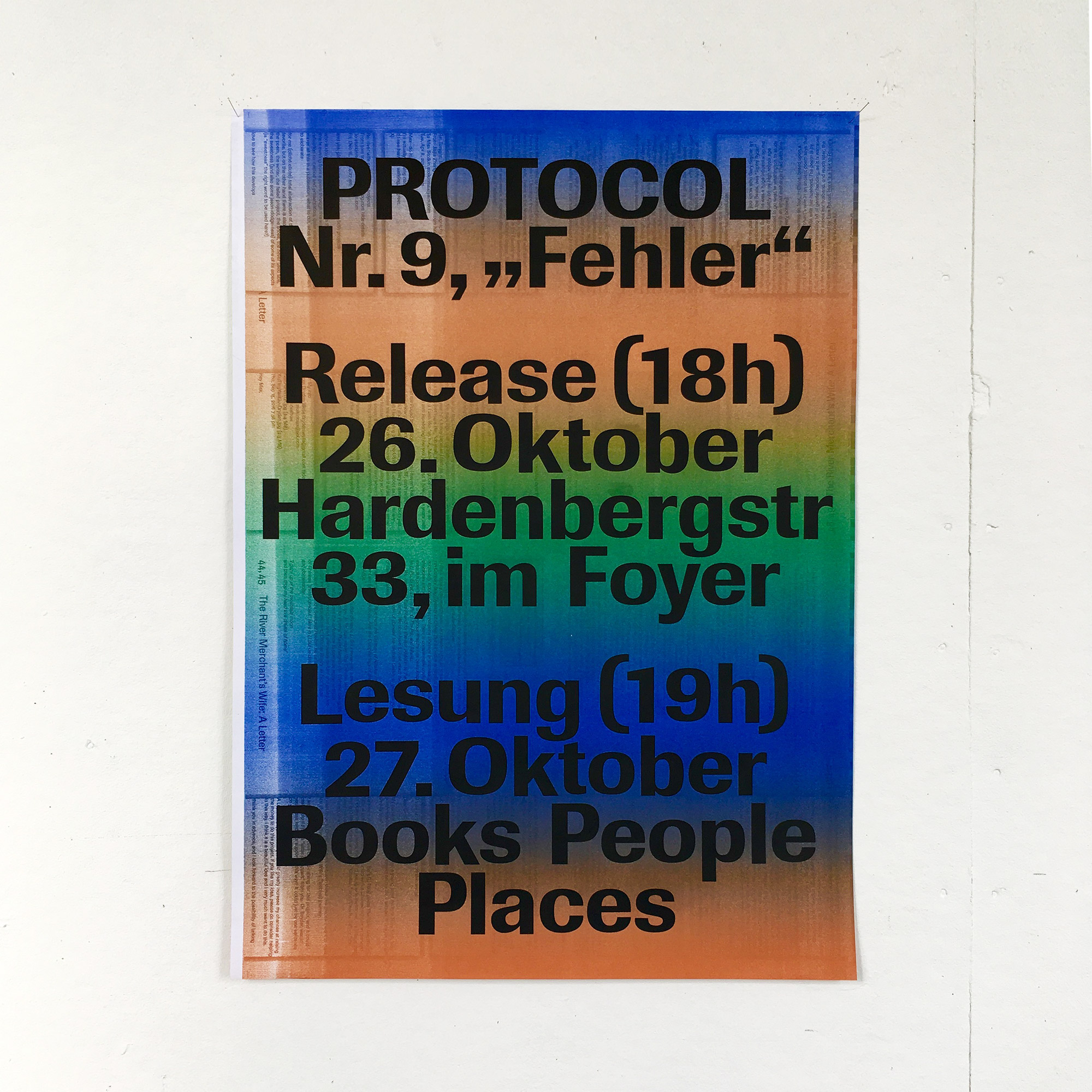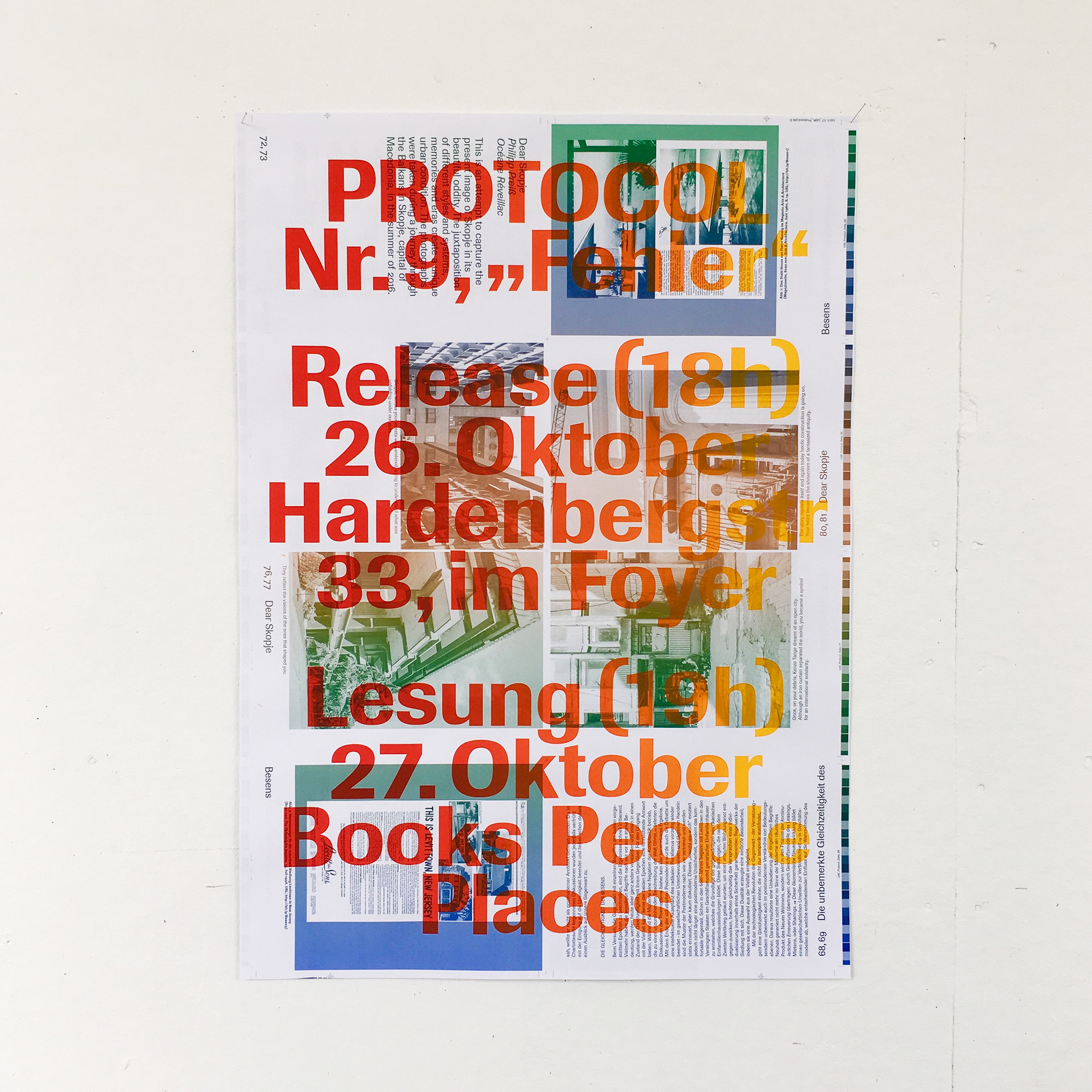 (DE) Die Protocol Nr.9: Die aktuelle Ausgabe versammelt eine Reihe an Arbeiten und Artikel rund um das Thema „Fehler“. Wir wollen das Hinterfragen von vermeintlich fehlerhaften Situationen als Potential betrachten, als Moment begreifen, in dem sich ein Möglichkeitsraum auftut. In diesem Sinne möchten wir euch alle herzlich zu unseren zwei Veranstaltungen im Zuge der Veröffentlichung einladen: Donnerstag, den 26. Oktober 2016, um 18 Uhr – Release-Party im Foyer des Hauptgebäudes der Universität der Künste (Hardenbergstr. 33, 10623 Berlin). Werft einen Blick in die neue Ausgabe und feiert mit uns! Samstag, den 28. Oktober, um 19 Uhr – Lesung bei BooksPeoplePlaces in der Kulmer Str. 20A in 10783 Berlin. Wir werden dort das Magazin und das Projekt Protocol vorstellen. Außerdem freuen wir uns auf unsere Autorinnen und Autoren, die dort aus ihren Artikeln lesen werden. Schaut vorbei und diskutiert mit uns!