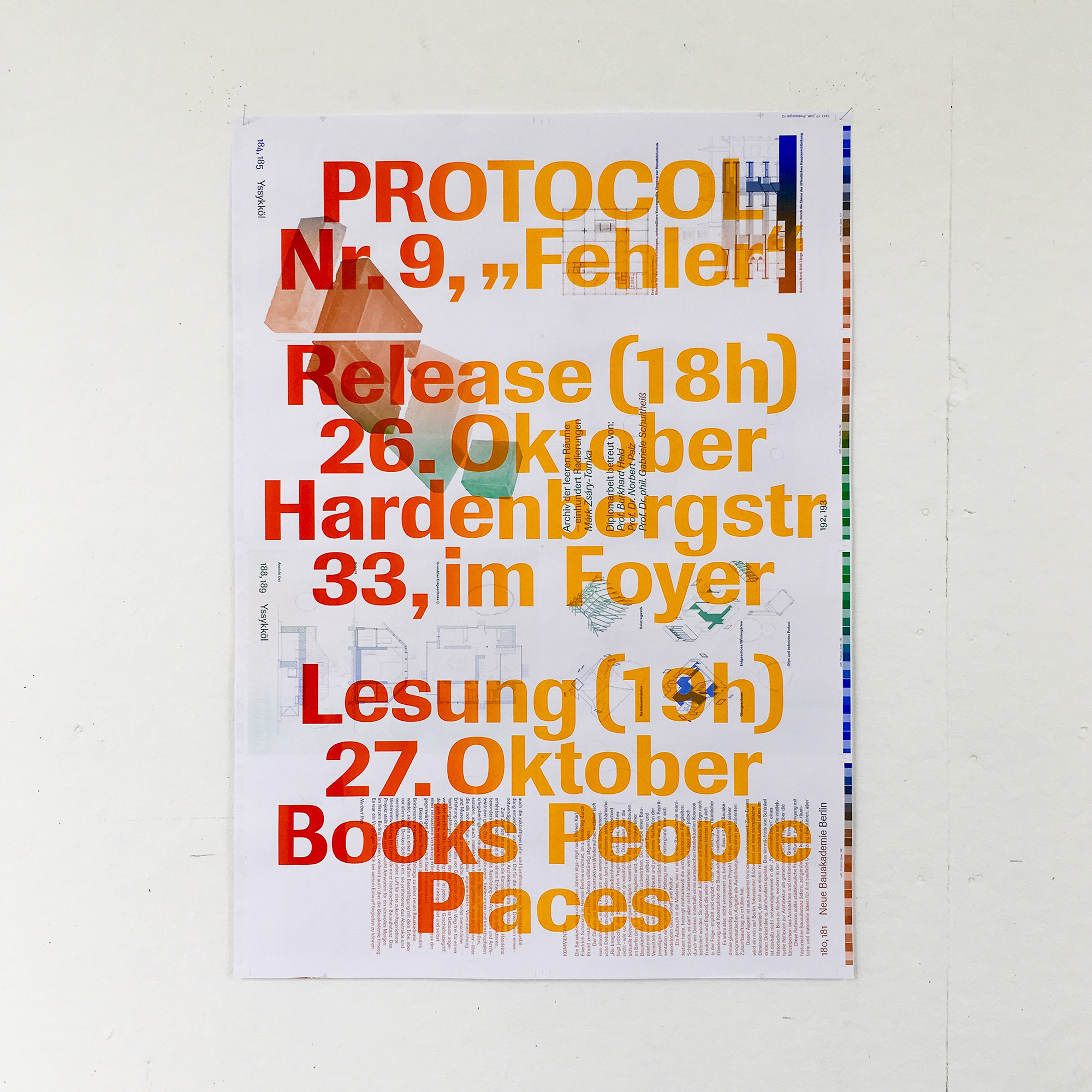 (EN) The Protocol Nr.9: The current issue showcases a variety of works and articles brought together under the theme of “mistake”. We would like to warmly invite you to our two release events: Thursday, October 26th, 2017 at 6 p.m.–Release in the entrance hall of the main building of the University of the Arts, Hardenbergstr. 33, 10623 Berlin. Come and celebrate with us! Saturday, October 28th, 2017 at 7 p.m.–Reading at BooksPeoplePlaces. This architecture book shop is located at Kulmer Str. 20A, 10783 Berlin. We are going to present the current issue and some of our authors are going to read from their articles. We are looking forward to the discussion–and seeing you around!