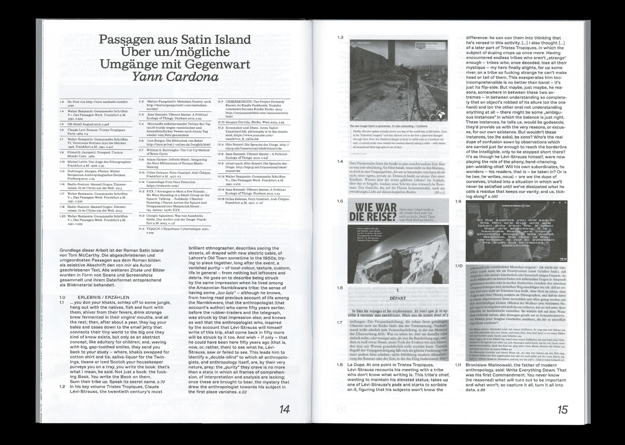 Wir sind mitunter mit dem Moment konfrontiert, in dem uns die Neugierde packt und der uns dazu veranlasst, sich mit dem geweckten Interesse auseinanderzusetzen. Diese Aufgeschlossenheit gegenüber dem Unbekannten und die Bereitschaft, ihm nachzugehen, birgt die Vorstellung einer diversen und reichhaltigen Produktion von Wissen und Referenzen. Die persönliche Erfahrung dieses Augenblicks ist nicht nur als Erwerb von Eindrücken zu verstehen, sondern erfährt dann eine andere Bedeutung, wenn sie reflektiert und abstrahiert wird. Erst durch diesen Prozess ist man imstande, die Gegenwart in Ausschnitten und Bruchstücken abzubilden. Die Wahrnehmung von Gegenwart ist per se gezeichnet durch zunehmende Verstrickungen von Beziehungen. Angesichts der Tendenzen und Folgen von Prozessen wie Finanzialisierungen, Digitalisierungen und Globalisierungen ist es nicht einfach, eine klare Vorstellung davon oder eine Übersicht darüber zu erlangen, was diese Gegenwart eigentlich ausmacht. Die unter Umständen quälende Unbestimmtheit der Situation steht im Widerspruch zu den festen narrativen Mustern, mit denen Geschehnisse der Vergangenheit zu Geschichte verarbeitet werden. Der Geschichte wird mit dem Epochenbegriff ein logischer Zusammenhang unterstellt, der in Vergangenheit, Gegenwart und Zukunft einen Plot zu haben scheint. Angesichts der Diskrepanz einer (dem Anschein nach) bereits reflektierten Chronik historischer Fakten und einer unübersichtlichen Gemengelage in der Gegenwart kann man sich vergegenwärtigen, dass Spaltungen, Öffnungen und Widersprüche der Vergangenheit der Kohärenz halber übergangen sein könnten. Zu Anfang des 20. Jahrhunderts unternahm Carl Einstein den Versuch, eben jenes Übergangene, Nebensächliche, Alltägliche, das mit der geschichtlichen Kontinuität und der klaren Entwicklung der Kunstformen in Konflikt steht, in die Kunstgeschichte rückzuführen. In Metahistory teilt Hayden White die Beobachtung, dass die Arbeit des Historikers weniger durch die Faktenlage und den argumentativen Umgang mit ihr geprägt ist als durch das Vermögen, den historischen Text als literarisches und poetisches Werk zu erzeugen. In der jüngeren Vergangenheit haben Ideen im Umfeld des Anthropozäns, der Technosphäre oder des Spekulativen Realismus an Aufmerksamkeit gewonnen, auch weil sie in der Lage sind, ein poröseres Verständnis von Relationen von und in der Zeit zu entwickeln. Jean-Luc Nancy beispielsweise beobachtet eine „nicht koordinierte Gleichzeitigkeit von Dingen oder Wesen, die Kontingenz ihrer Kozugehörigkeiten, die Streuung im Wuchern von Aspekten, Arten, Kräften, Formen, Spannungen und Intentionen (Instinkten, Trieben, Projekten, Elanen). In dieser Fülle macht sich keine Ordnung über die anderen geltend: Sie scheinen alle — Instinkte, Reaktionen, Reizbarkeiten, Konnektivitäten, Gleichgewichte, Katalysen, Stoffwechsel — dazu bestimmt, sich ineinander zu verfangen, wechselseitig zu erfassen, sich gegenseitig aufzulösen oder sich miteinander zu vermischen und durcheinanderzugeraten.” Begreift man die Konstellationen, in denen wir uns befinden, als Netzwerk wechselseitiger Beziehungen, als Häufung unterschiedlicher Punkte und Vektoren, so scheint die Überlagerung einzelner, persönlicher Beschreibungen ein geeignetes Mittel zu sein, um ein Gefühl dafür zu entwickeln, was um uns passiert – in Abhängigkeit zu unseren eigenen Erfahrungshorizonten. Die Ansammlung dieser unterschiedlichen Fragmente (die ihrerseits wiederum Spuren, Echos, Zitate, Zensuren beinhalten), lässt durch den fehlenden Anspruch auf Vollständigkeit Leerstellen offen, mit denen virtuelle Ergänzungen und Verknüpfungen, Anschlussmöglichkeiten an andere Texte einhergehen. Dabei steht der Akt des Formulierens (das dem Wahrgenommenen eine Form geben) als Moment im Vordergrund, in dem man Beobachtungen und Vorstellungen nach außen trägt, anderen zur Verfügung stellt, mit anderen teilt. Die Form selbst ist insofern sekundär, als sowohl das analytische Beobachten nach wissenschaftlicher Vorgehensweise als auch das Absichtslose, das Informelle (das Informe Batailles) das Potential beinhaltet, als Information beim Empfänger ein bestimmtes Denkverhalten anzuregen. Somit birgt das Festhalten, das Aufzeichnen, das Festschreiben von Erfahrungen eine Möglichkeit, ein Bild der aktuellen Geschehnisse zu erzeugen, ohne auf Kohärenz oder Deckungsgleichheit aus zu sein. Gerade durch die Kombination unterschiedlicher Interessensgebiete, Neugierden und Perspektiven sind Konfrontationen und Widersprüche möglich und überlassen es der oder dem Einzelnen, die Positionen der Anderen mit den eigenen abzugleichen, zu relativieren — sich zu positionieren.